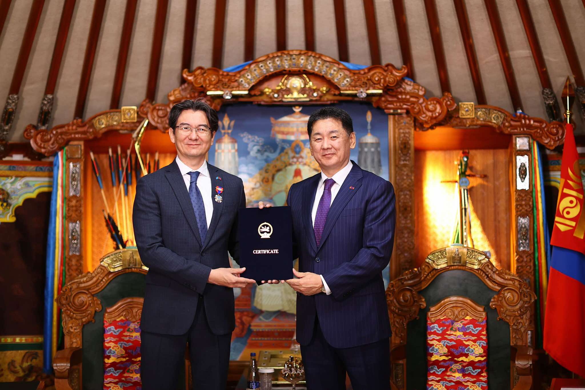 Ерөнхийлөгч У.Хүрэлсүх хоёр орны харилцааг шат ахиулан хөгжүүлэхэд оруулсан хувь нэмэр, хүчин чармайлтыг нь үнэлж Элчин сайд Г.Койшибаевийг “Найрамдал” медалиар шагналаа.
