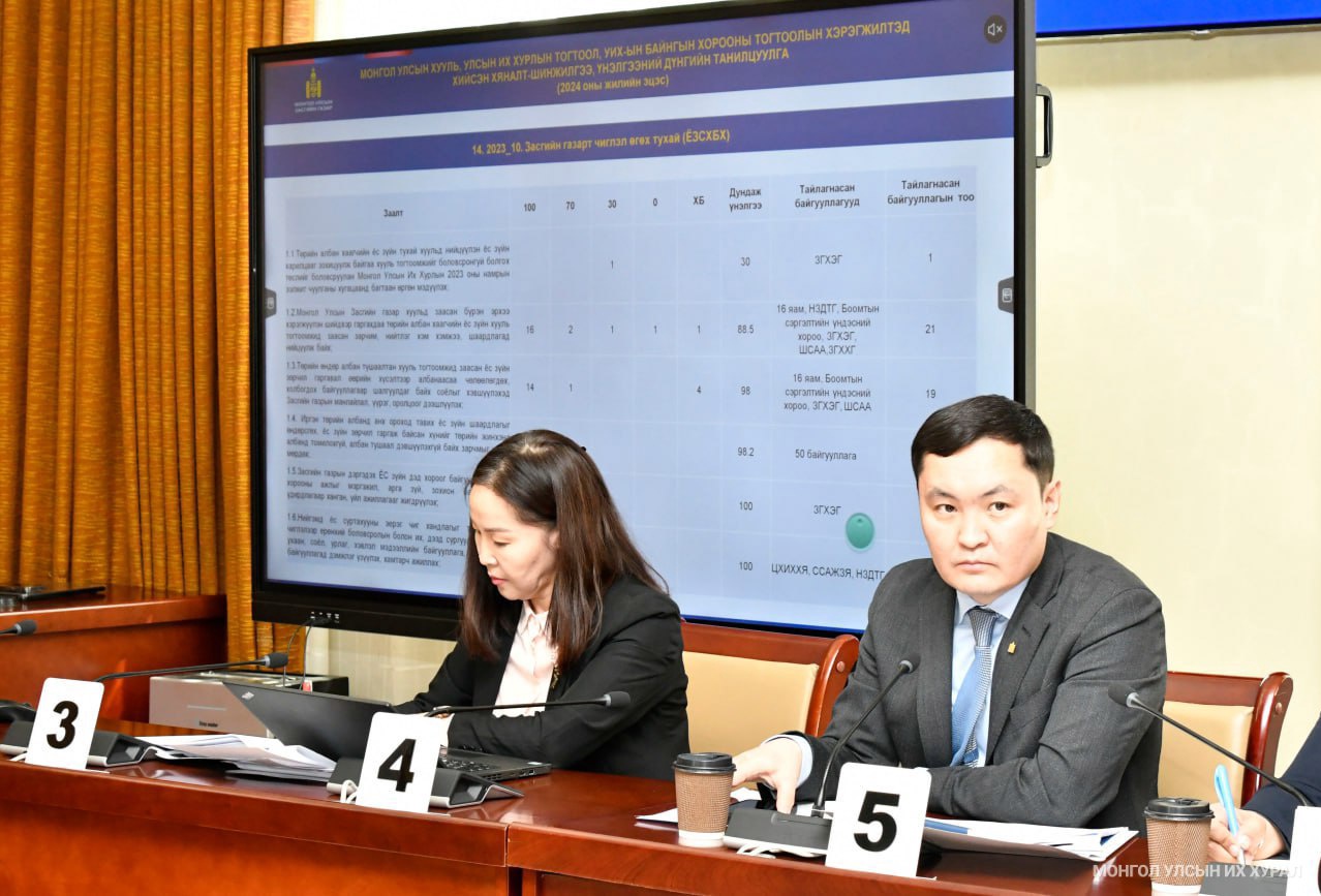 Тэрбээр, Монгол Улсын 89 хуулийн 481, УИХ-ын 104 тогтоолын 624, УИХ-ын байнгын хорооны 79 тогтоолын 445, нийт 272 шийдвэрийн 1550 заалт үнэлгээний мэдээллийн цахим сан (new.unelgee.gov.mn)-д бүртгэлтэй байна. Хяналт-шинжилгээ, үнэлгээний мэдээллийн цахим санд бүртгэлтэй байгаа УИХ болон УИХ-ын байнгын хорооны шийдвэрийг үнэлгээний ангиллаар авч үзэхэд 569 буюу 36.7 хувь нь “бүрэн хэрэгжсэн”, 390 буюу 25.2 хувь нь “хэрэгжих шатанд”, 224 буюу 14.5 хувь нь “хэрэгжилт хангалтгүй”, 196 буюу 12.6 хувь нь “хэрэгжээгүй” гэж дүгнэгдсэн болно. Харин хэрэгжилтийг тооцох хугацаа болоогүй үндэслэлээр 170 заалт үнэлэх боломжгүй болно. Хэрэгжилт дунджаар 66.4 хувь байна. Энэ нь өмнөх онтой харьцуулахад 3.8 хувиар өссөн үзүүлэлттэй байна. Хяналт-шинжилгээ, үнэлгээний мэдээллийн цахим санд бүртгэлтэй байгаа хуулийн нийт 481 заалтын 69 буюу 14.3 хувь нь хэрэгжээгүй, УИХ-ын тогтоолын нийт 624 заалтын 80 буюу 12.8 хувь нь хэрэгжээгүй, УИХ-ын байнгын хорооны тогтоолын нийт 445 заалтын 44 буюу 9.9 хувь нь хэрэгжээгүй бөгөөд Хууль, УИХ болон байнгын хорооны тогтоолын нийт 1550 заалтын 193 буюу 12.5 хувь нь “хэрэгжээгүй” байна. Үүнээс Ёс зүй, сахилга хариуцлагын байнгын хорооны нийт 2 тогтоолын 14 заалт бүртгэлтэй байгаа бөгөөд 2023 оны 10 дугаар тогтоолын хэрэгжилт 53.8 хувь, 2024 оны 06 дугаар тогтоолын хэрэгжилт 68.5 хувь байна гээд УИХ-ын Ёс зүй, дэгийн байнгын хорооноос Засгийн газарт чиглэл өгөх тухай заалтуудын хэрэгжилтийг нэг бүрчлэн танилцуулав. Тухайлбал, Төрийн албан хаагчийн ёс зүйн тухай хуульд нийцүүлэн ёс зүйн харилцааг зохицуулж байгаа хууль тогтоомжийг боловсронгуй болгох төслийг боловсруулан УИХ-ын 2023 оны намрын ээлжит чуулганы хугацаанд багтаан өргөн мэдүүлэх заалт 30 хувьтай, Засгийн газар хуульд заасан бүрэн эрхээ хэрэгжүүлэн шийдвэр гаргахдаа төрийн албан хаагчийн ёс зүйн хууль тогтоомжид заасан зарчим, нийтлэг хэм хэмжээ, шаардлагад нийцүүлж байх заалтын хэрэгжилт 88,5 хувьтай, төрийн өндөр албан тушаалтан хууль тогтоомжид заасан ёс зүйн зөрчил гаргавал өөрийн хүсэлтээр албанаасаа чөлөөлөгдөх, холбогдох байгууллагаар шалгуулдаг байх соёлыг хэвшүүлэхэд Засгийн газрын манлайлал, үүрэг, оролцоог дээшлүүлэх гэсэн заалт 98 хувьтай, иргэн төрийн албанд анх ороход тавих ёс зүйн шаардлагыг өндөрсгөх, ёс зүйн зөрчил гаргаж байсан хүнийг төрийн жинхэнэ албанд томилохгүй, албан тушаал дэвшүүлэхгүй байх зарчмыг хатуу мөрдөх заалт 98,2 хувьтай тус тус хэрэгжиж байна гэв. Энэхүү танилцуулгынхаа төгсөлд, төрийн захиргааны төв байгууллагууд хууль тогтоомж, тогтоол шийдвэрийн хэрэгжилтийг тайлагнахдаа харьяа байгууллагын хүрээнд хэрэгжүүлсэн арга хэмжээний үр дүнг нэгтгэн тайлагнахгүй зөвхөн яамны хэмжээнд хэрэгжүүлсэн арга хэмжээг тайлагнаж байгаа нь хэрэгжилт бүрэн, тодорхой гаргахгүй байх үндэслэл болж байна. Хоёрт, УИХ-ын тогтоол болон УИХ-ын байнгын хорооны тогтоолоор Засгийн газарт үүрэг, чиглэл болгосон шийдвэр гарсан тухай бүр холбогдох газар хүргүүлэхгүй байгаагаас зарим шийдвэрийг тухай бүр цахим системд хяналтад бүртгэх, боломжгүй байдал байсаар байна. Холбогдох байгууллагууд хууль тогтоомж, тогтоол шийдвэрийн хэрэгжилтийг тайлагнахдаа өмнөх тайлант хугацааны биелэлттэй харьцуулан үзэж, хүрсэн үр дүнг тайлагнаагүй, утга агуулгын хувьд алдаатай тайлагнах, өмнөх оны хэрэгжилтийг хуулбарлан давтан тайлагнасан, өөрийн үнэлгээг бодитой үнэлээгүй зэрэг алдаа нийтлэг байгааг 