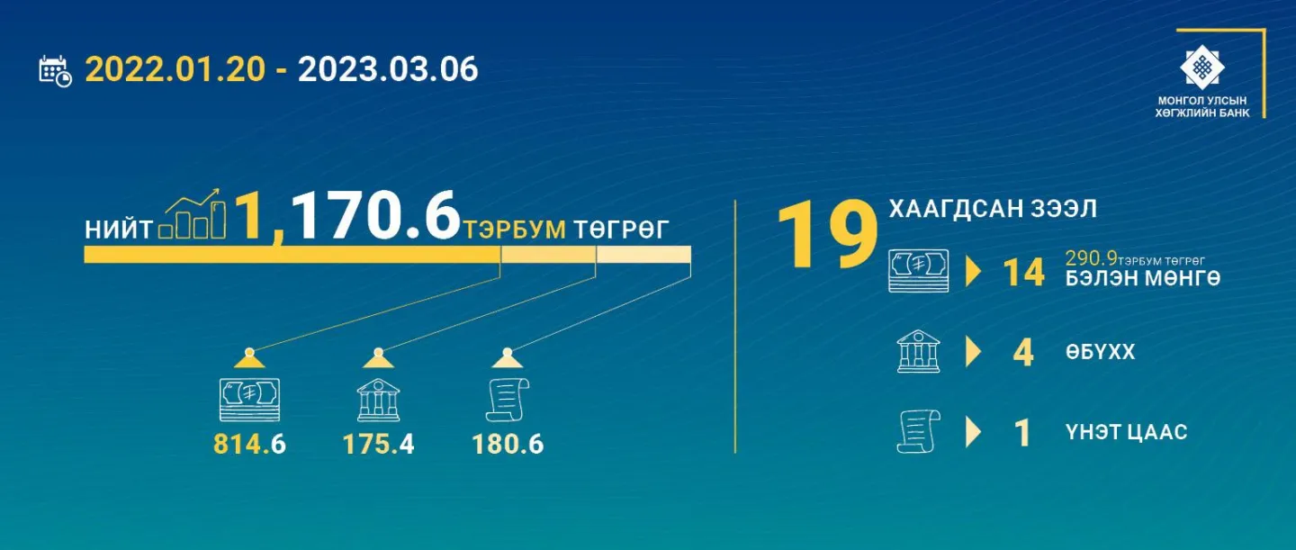 Хөгжлийн банканд 2022 оны 1 дүгээр сарын 20-ны өдрөөс 2023 оны 3 дугаар сарын 6-ны хооронд нийт 1170.6 тэрбум төгрөгийн зээл барагдууллаа. Үүнээс 814.6 тэрбум төгрөгийг бэлэн мөнгөөр, 175.4 тэрбум төгрөгийг өмчлөх бусад үл хөдлөх хөрөнгөөр, 180.6 тэрбум төгрөгийг үнэт цаасаар төвлөрүүлээд байна. Нийт 19 төсөлд олгосон зээл хаагдсанаас 14 зээл бэлнээр буюу 290.9 тэрбум төгрөгөөр, 4 зээл өмчлөх бусад үл хөдлөх хөрөнгө, нэг зээл үнэт цаасаар төлөгдсөн.
