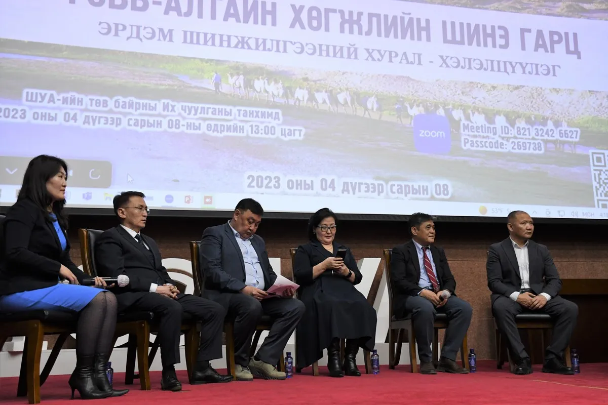 Монгол Улсын Шинжлэх ухааны академи Говь-Алтай аймгийн ЗДТГ хамтран “Говь-Алтайн хөгжлийн шинэ гарц” эрдэм шинжилгээний хурал хэлэлцүүлэг /2023.04.08/ зохион байгууллаа. Хэлэлцүүлэгт Говь-Алтай аймгаас төрөн гарсан акадeмич, эрдэмтэд, доктор, профeссоруудаас бүрдсэн 100 орчим эрдэмтэн судлаач оролцож, нутгийн хөгжил, хөгжлийн шийдлээр санал солилцож, илтгэл хэлэлцүүлээ.