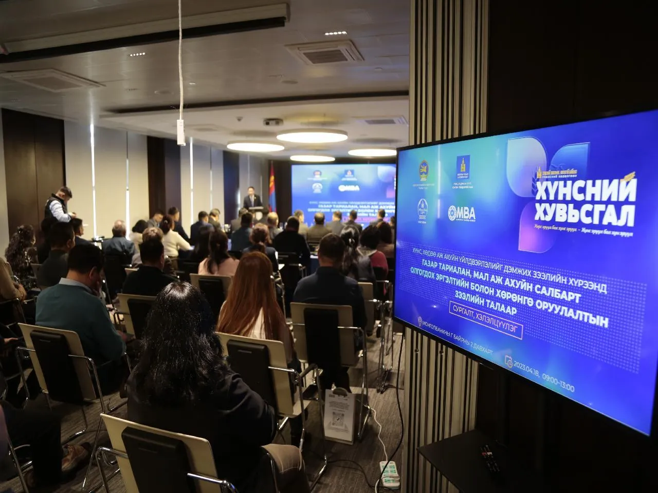 Хүнс, хөдөө аж ахуйн үйлдвэрлэлийг дэмжих зээлийн хүрээнд газар тариалан, мал аж ахуйн салбарт олгох эргэлтийн болон хөрөнгө оруулалтын зээлийн талаар” сургалт-хэлэлцүүлгийг зохион байгууллаа. Арга хэмжээнд Монгол Улсын Ерөнхийлөгчийн Тамгын газар, Хүнс, хөдөө аж ахуй, хөнгөн үйлдвэрийн яам, Монголбанк, Монголын банкны холбоо, мал аж ахуй, газар тариалангийн салбарын аж ахуй нэгж байгууллага, иргэд оролцов.