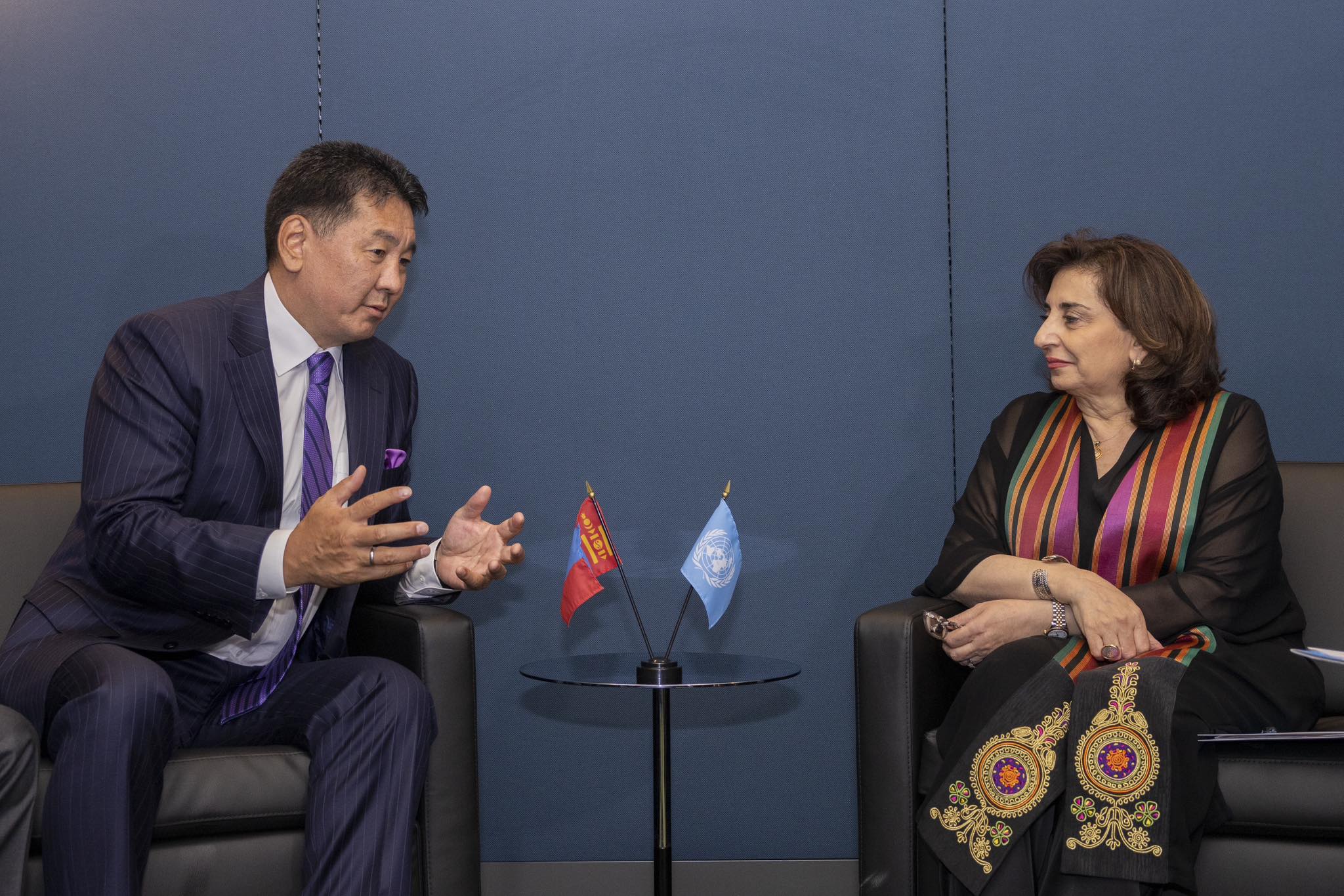 Монгол Улсын Ерөнхийлөгч Ухнаагийн Хүрэлсүх НҮБ-ын Ерөнхий Ассамблейн 78 дугаар чуулганы Ерөнхий санал шүүмжлэлд оролцох үеэрээ 2023 оны 09 дүгээр сарын 21-ний өдөр НҮБ-ын Эмэгтэйчүүдийн байгууллагын гүйцэтгэх захирал Сима Бахустай уулзав.