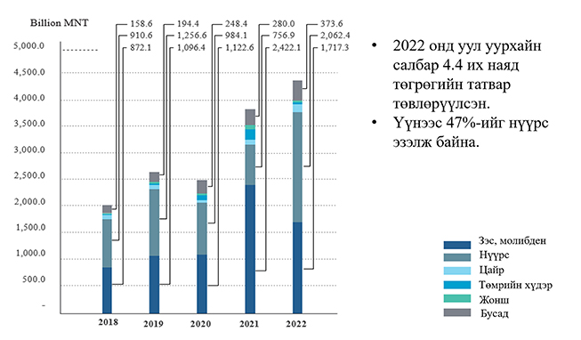 Нүүрс бол Монгол Улсын орлогын гол эх үүсвэр. Уул уурхайн бүтээгдэхүүн нийт экспортын 90 гаруй хувийг бүрдүүлдэг бол түүний талаас илүүг нүүрс бүрдүүлж байна. Цаашдаа нь ийм байх нь дамжиггүй. Нүүрс мөн төсөв бүрдүүлэгч гол эх үүсвэр юм. 2022 онд уул уурхайгаас төсөвт 4.4 их наяд төгрөг төвлөрүүлсний 47%-ийг нүүрснээс төвлөрүүлсэн байна.