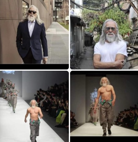 Мөнгөн буурал, урт үсээ хийсгэн, булчинлаг нүцгэн цээж, тэвхгэр мөрөө гайхуулан эрч хүч дүүрэн шалмаг алхан гарч ирж байгаа 80 настай модел олны анхаарлыг соронздон татсан юм.