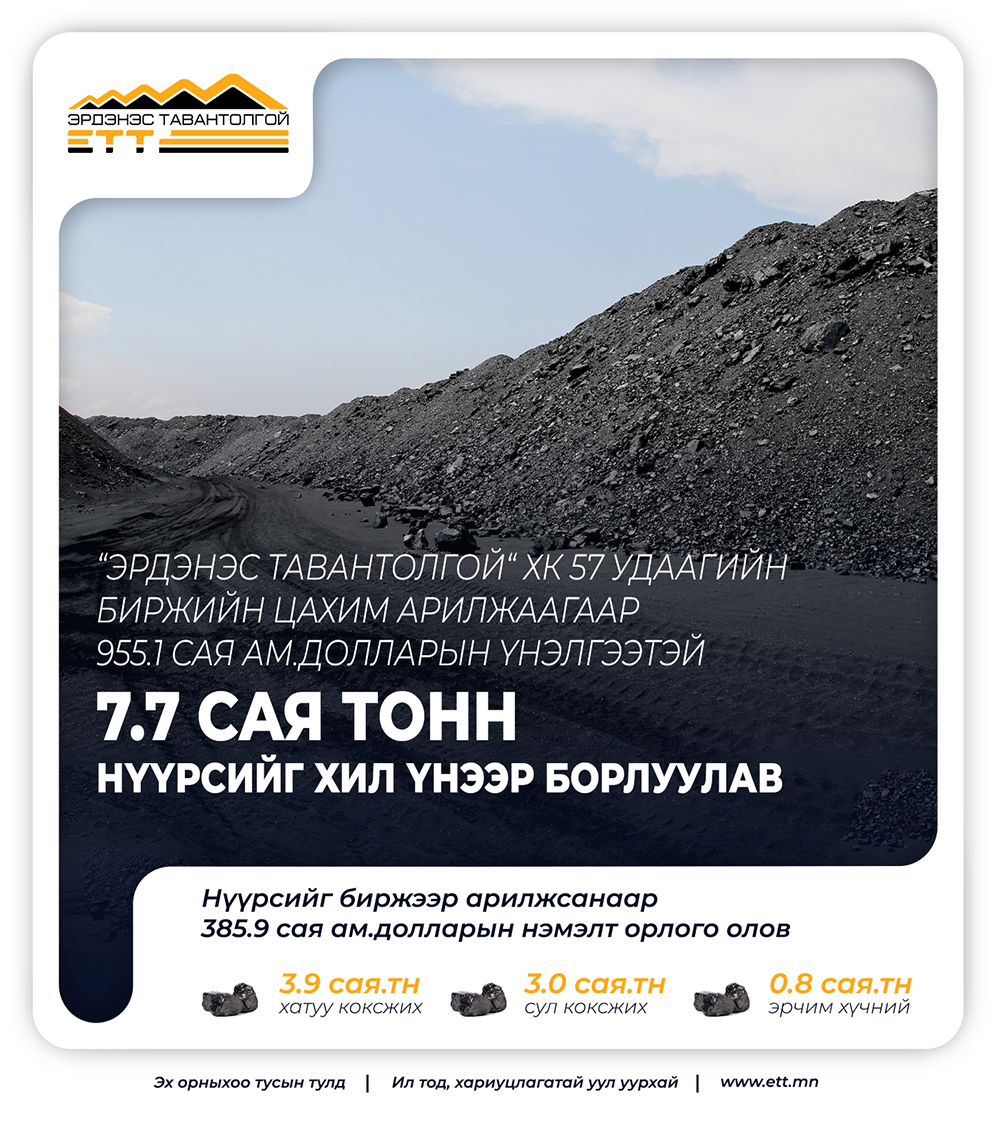 “Эрдэнэс Тавантолгой” ХК 2023 оны 2 дугаар сарын 9-ний өдрөөс өнөөдрийг хүртэл хугацаанд нийт 57 удаагийн биржийн цахим арилжаа зохион байгуулж, 955.1 сая долларын үнэлгээтэй 7.7 сая тонн нүүрсийг хил үнээр борлуулаад байна. Үүнээс 3.9 сая тонн нүүрс нь хатуу коксжих чанартай нүүрс, 3.0 сая тонн нүүрс нь сул коксжих нүүрс, 0.8 сая тонн эрчим хүчний нүүрс байна. Нүүрсийг биржээр арилжсанаар 385.9 сая ам долларын нэмэлт орлого олоод байна.