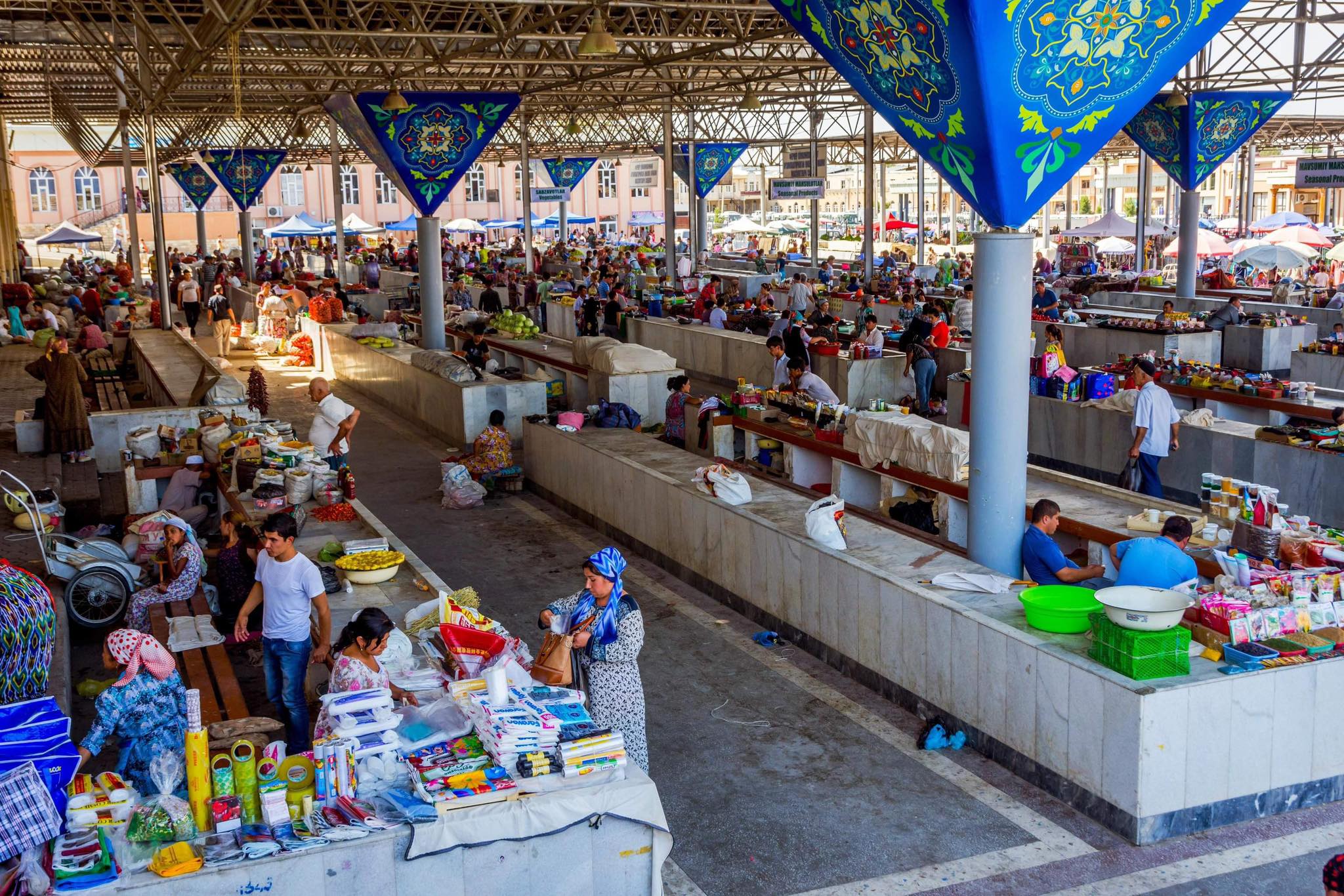 Самаркандынхаа алдарт хивсээ дэлгэж, үндэсний хээтэй хурц тод өнгийн торгодаа намируулсан дэлгүүрүүдтэй зэрэгцээд даавууны дэлгүүрүүд өнгө алаглана. Маалинган даавуу, бор маарилан материалуудыг том томоор хуйлан ороож ханаа эгнүүлэн босгоод өрчихөж. Худалдагчид нь хаалга үүдээ дэлгэн ор ор хэмээн гараараа дохин найрсгаар урина.
