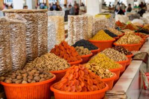 Самаркандын захаар явахад яг л тэр үед очсон мэт мэдрэмж төрнө. Тэд өнөө л хатаасан амтат жимс, хар чавга, инжир, үзэм, чангаанз, хушга, ойн самар, газрын самар, шинэ ургацын жимс ногоо, пирамид хэлбэртэй улаан, шар, хүрэн өнгөт хоол амтлагчдаа худалдаалан аж төрцгөөж байна. Энд ёстой л “хүний хар нүд”-нээс бусад нь бий бололтой. Захын худалдаа бэлэн мөнгөөр хийгдэнэ, заримдаа хариулт мөнгөний оронд хэдэн бөндгөр курут-курт ааруул хурууд өгөх жишээтэй.