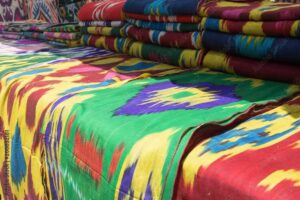 Узбек охид хүүхнүүд хурц өнгөтөй нүд гулгасан атласан даашинзаар гангардаг нь олон төрлийн торго даавууны нэг төрөл юм.