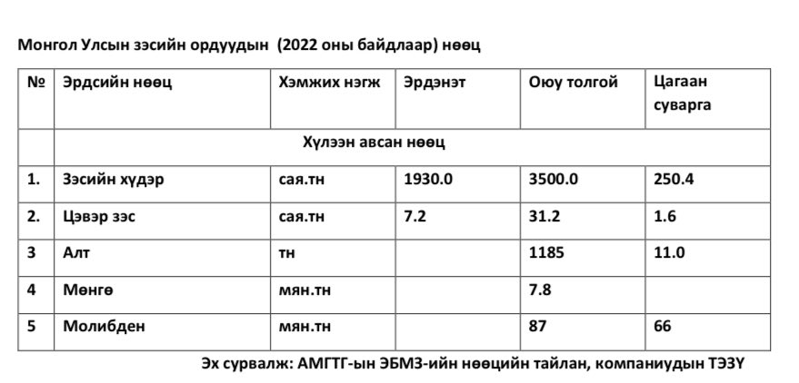 Монгол Улс нь зэсийн нөөцийн үзүүлэлтээрээ дэлхийн хэмжээнд өрсөлдөх чадвар өндөр байна байгааг энэ үзүүлэлт харуулна. Өмнөговьд аймагт үйл ажиллагаа явуулж байгаа зэс, алтны томоохон төсөл “Оюутолгой”-н ил уурхайн тогтвортой ажиллаж, далд уурхай (2023 он) ашиглалтад орсноор Монгол Улсын зэсийн баяжмалын экспорт ОХУ, Казахстан болон Бразил зэрэг улсаас давж, дэлхийн зэсийн баяжмалын экспортын хэмжээгээр 6 дугаар эрэмблэгдэх болжээ.
