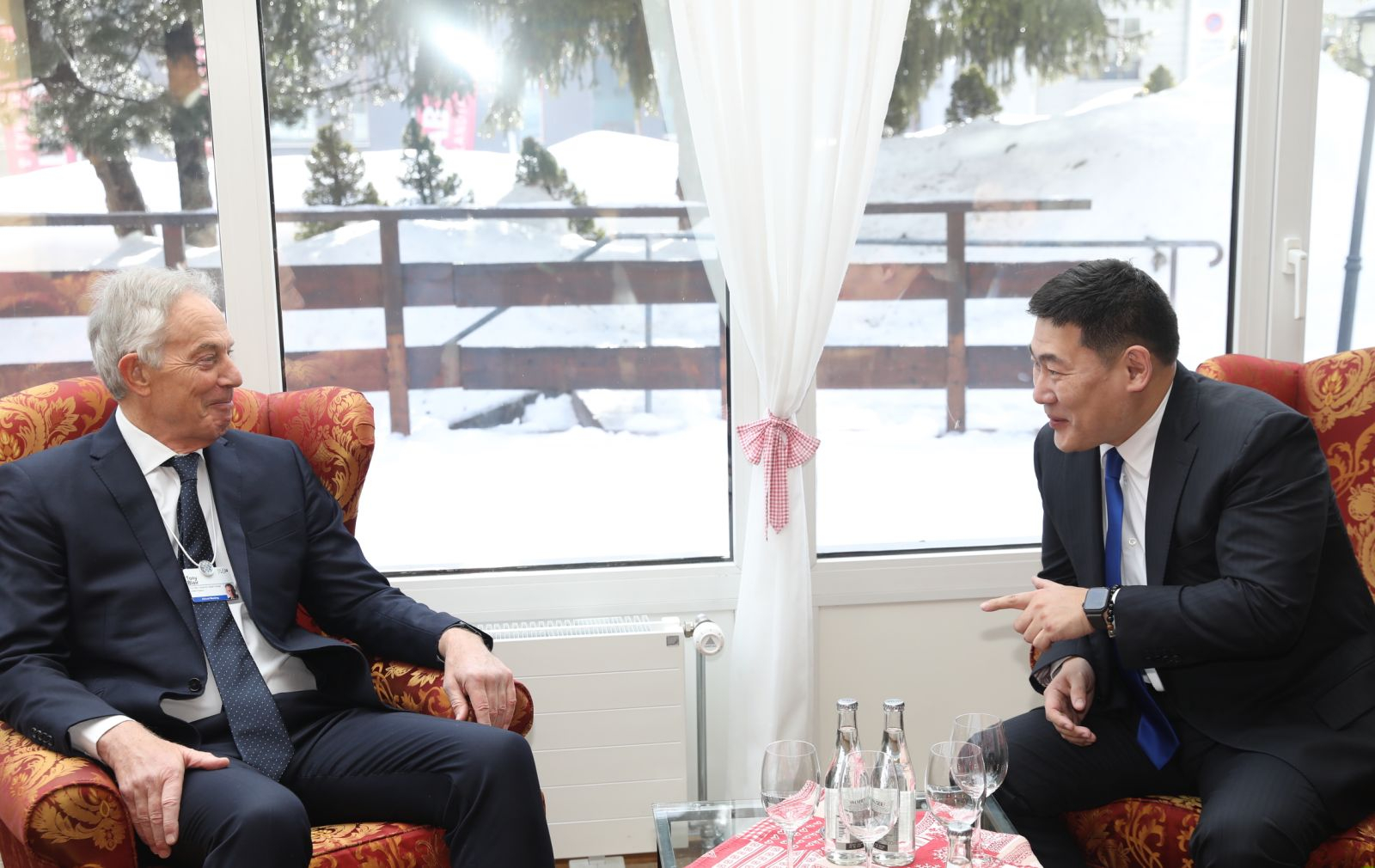 Монгол Улсын Ерөнхий сайд Л.Оюун-Эрдэнэ Швейцарийн Холбооны Улсын Давос хотноо болж буй Дэлхийн эдийн засгийн 54 дэх чуулга уулзалтын үеэр Их Британийн Ерөнхий сайд асан Тони Блэйртэй 2024 оны нэгдүгээр сарын 18-ны өдөр уулзлаа.