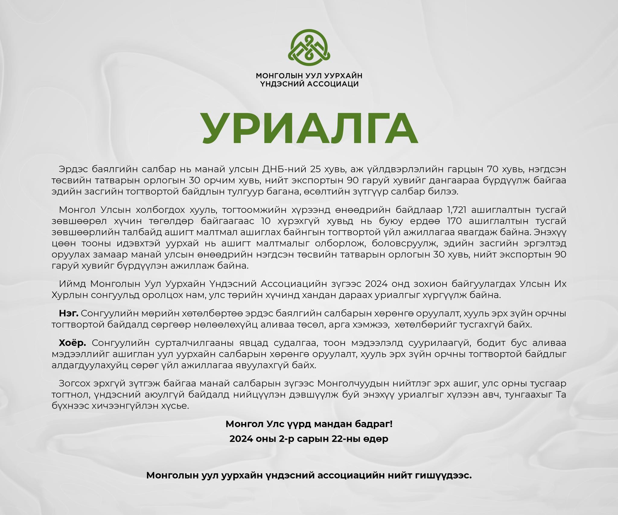 Мөн 2024 онд зохион байгуулагдах Улсын Их Хурлын сонгуультай холбогдуулан эрдэс баялгийн салбарын зүгээс улс төрийн нам, хүчнүүдэд хандсан Уриалга гаргахаар шийдвэрлэжээ. Ингэхдээ сонгуулийн жилийн улс төрийн хөтөлбөр, үйл ажиллагаанд эдийн засгийн тулгуур салбараа “оноо авах” зорилго сэдлээр ашиглах, тогтвортой байдалд нь сөргөөр нөлөөлөх аливаа үйлдлээс татгалзаж, улс орны нийтлэг эрх ашгаа мартахгүй байхыг уриалсан байна.