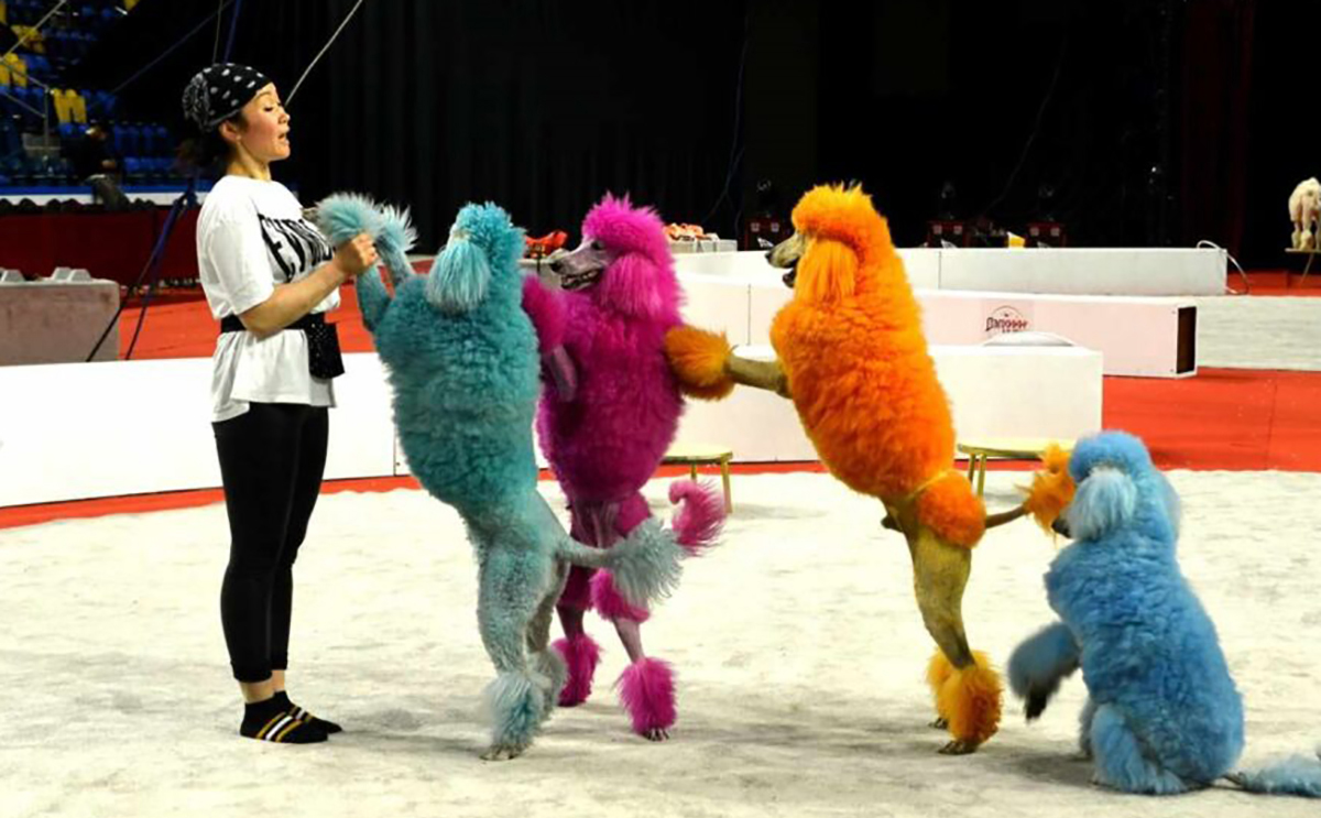 Мөсөн өргөөнд зассан хос манеж дээр ирэх бямбад үүдээ нээх дэлхийн циркийн жүжигчид дасгал сургуулилтаа хийж байна. Хурц тод өнгөтэй гоёмсог найман пудель давхин гарч ирэхдээ өөрийн эрхгүй “Хөөх” гэмээр эрчим цацруулах юм. Сургагчийнхаа заавраар дуулгавартай нь аргагүй үсэрч, хойд хоёр хөл дээрээ зогсож, гүйж онц сурлагатан шиг л байх юм, тэд.