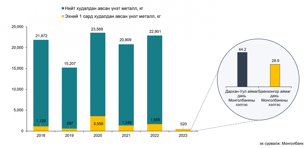 Монголбанк 2023 оны нэгдүгээр сард нийт 519.8 кг үнэт металл худалдан аваад байна. Дархан-Уул аймаг дахь Монголбанкны хэлтэс 44.2 кг, Баянхонгор аймаг дахь Монголбанкны хэлтэс 28.9 кг үнэт металл тус тус худалдан авсан.