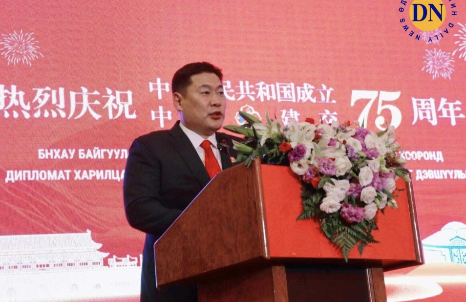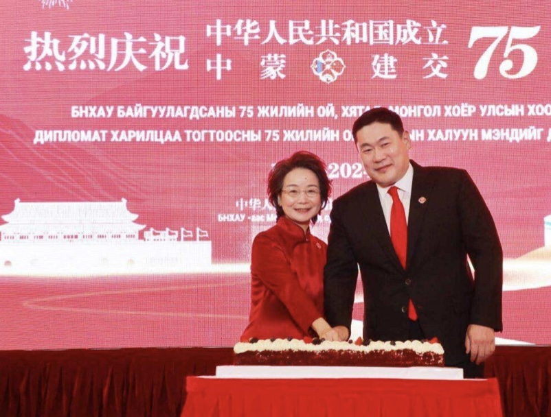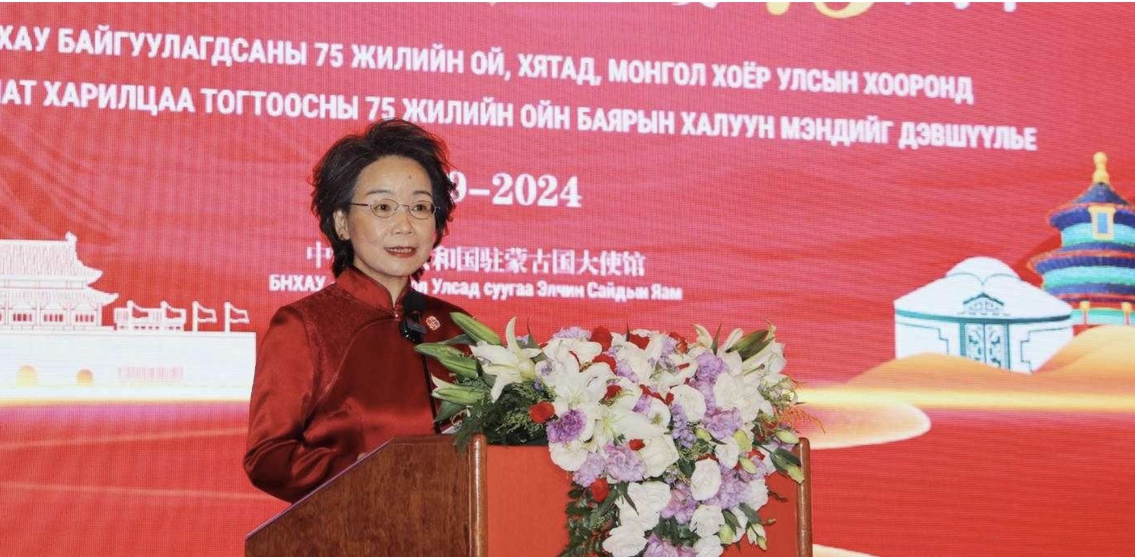 Олон жилийн дараа, Үндэсний баяр, Дипломат харилцаа тогтоосны баярын хүлээн авалтыг Элчин сайдын яамны байранд дахин зохион байгуулж байгаа нь урт хугацаанд Хятад, Монгол хоёр орны найрамдалдүнэтэй хувь нэмрээ оруулж байсан үе үеийн ахмад дипломат ажилтнуудад хүндэтгэл үзүүлж байна. Мөн миний бие үе залгамжлан Хятад, Монгол хоёр улсын харилцаанд шинээр ирсэн хүний хувьд, Монгол Улсад суугаа анхны эмэгтэй Элчин сайдын хувьд их нэр төртэй, бахархаж байна! Асар их бэрхшээлийг даван туулж байж агуу амжилт ирдэг.Хятадын коммунист намын хүчирхэг удирдлагын дор, 75 жилийн хугацаанд БНХАУ ядуурал, эмзэг дорой байдлаас дэлхийн хоёр дахь том эдийн засаг болтлоо хөгжин цэцэглэж, үндэсний хүчирхэгжилт, олон улсын нөлөөнд түүхэн үсрэлт хийсэн билээ. Ялангуяа, ХКН-ын Төв хорооны 18 дахь удаагийн хурлаас хойш Хятадын онцлогтой социализм шинэ эрин үед нэвтэрч, Хятад үндэстэн туйлын ядуурлаас ангижран, бүх талаараа анхан шатны чинээлэг түвшинд хүрч, бүх нийтийн чинээлэг хөгжлийн замд орсон. Жежянь муж бол Ши Жиньпин даргын ажиллаж байсан, мөн Ерөнхий сайд Ли Чяны төрсөн нутаг бөгөөд бүх нийтийн чинээлэг хөгжлийн жишиг бүс нутаг юм. Инновацид суурилсан өндөр түвшний хөгжил тасралтгүй гүнзгийрсээр байна. Цахилгаан машин, литийн нөөц хураагуур, нарны хавтан гэх “Гурван шинэ бүтээл” нь “Хятадад үйлдвэрлэв” тодотголтой шинэ нэрийн хуудас болж, Жиаолун шумбагчдалайн гүнд шумбаж, С919 нисэх онгоц тэнгэрт хөөрч, сансар огторгуйд Шенжоу хөлгүүд нисч байна. Нүүрстөрөгч багатай ногоон экологийн соёл иргэншлийг хүч түрэн хөгжүүлж, хиймэл ойжуулалт, сэргээгдэх эрчим хүчний нийлүүлэлтээр дэлхийд тэргүүлэн, Хятадын ногоон уул, цэнгэг нуурын үзэсгэлэнд өнгө нэмсээр байна. Хятад Улс Хувь заяаны хамтын нийгэмлэгийг байгуулахаас эхлээд “Бүс ба зам” санаачилгын хамтын бүтээн байгуулалт, даян дэлхийн гурван том санаачилга хүртэл дэлхийн засаглалыг сайжруулахын төлөө өөрчлөгдөж буй дэлхий ертөнцөд Хятадын мэргэн ухаан, арга шийдлээр хувь нэмрээ оруулж байна. Хөгжлийн замд орсон хэдий ч урагш ахихын тулд хичээн зүтгэх хэрэгтэй. Энэ оны долдугаар сард, ХКН-ын 20 дахь удаагийн сонгогдсон Төв хорооны гуравдугаар бүгд хурал амжилттай болж, цаашид шинэчлэл өөрчлөлтийг тал бүрээр гүнзгийрүүлж, Хятад маягийн орчин үеийн шинэчлэлийг ахиулах томоохон дүр зургаа тодорхойлж, дэлхий дахинд тодорхой дохиог илгээж байна. Хятад Улс дээд түвшний социалист зах зээлийн эдийн засгийн тогтолцоог байгуулж, өндөр зэрэглэлийн хөгжлийг ахиулан, дээд түвшний гадаад нээлттэй тогтолцоо, механизмийг сайжруулах болно. Ши Жиньпин даргын хэлснээр “Үзэмж төгс ганц цэцэг хавар болдоггүй, харин бүрэн дэлгэрсэн зуун цэцэгс дэлгэр хаврыг авчирдаг”. Хятад Улсын шинэ хөгжил дэлхий ертөнцөд шинэ боломжуудыг дагуулах нь гарцаагүй бөгөөд ялангуяа хөгжиж буй орнуудад шинэ эрмэлзлэлийг авчрах болно. Бид цаашид хөгжиж буй орнуудын аж үйлдвэржилтийг үргэлжлүүлэн дэмжиж, ард түмний амьжиргааны асуудлыг шийдвэрлэхэд туслалцаа үзүүлэн, тогтвортой хөгжилд аль болох хурдан хүрч, сайн сайхан маргаашийн төлөө хамтдаа зүтгэх болно! Ноёд хатагтай нар аа, найз нөхөд өө. Энэ жил Хятад, Монгол хоёр улсын хооронд дипломат харилцаа тогтоосны 75 жил, Найрамдал харилцаа хамтын ажиллагааны тухай гэрээ байгуулсны 30 жил, Иж бүрэн стратегийн түншлэлийн харилцаа тогтоосны 10 жилийн ой тус тус тохиож ба