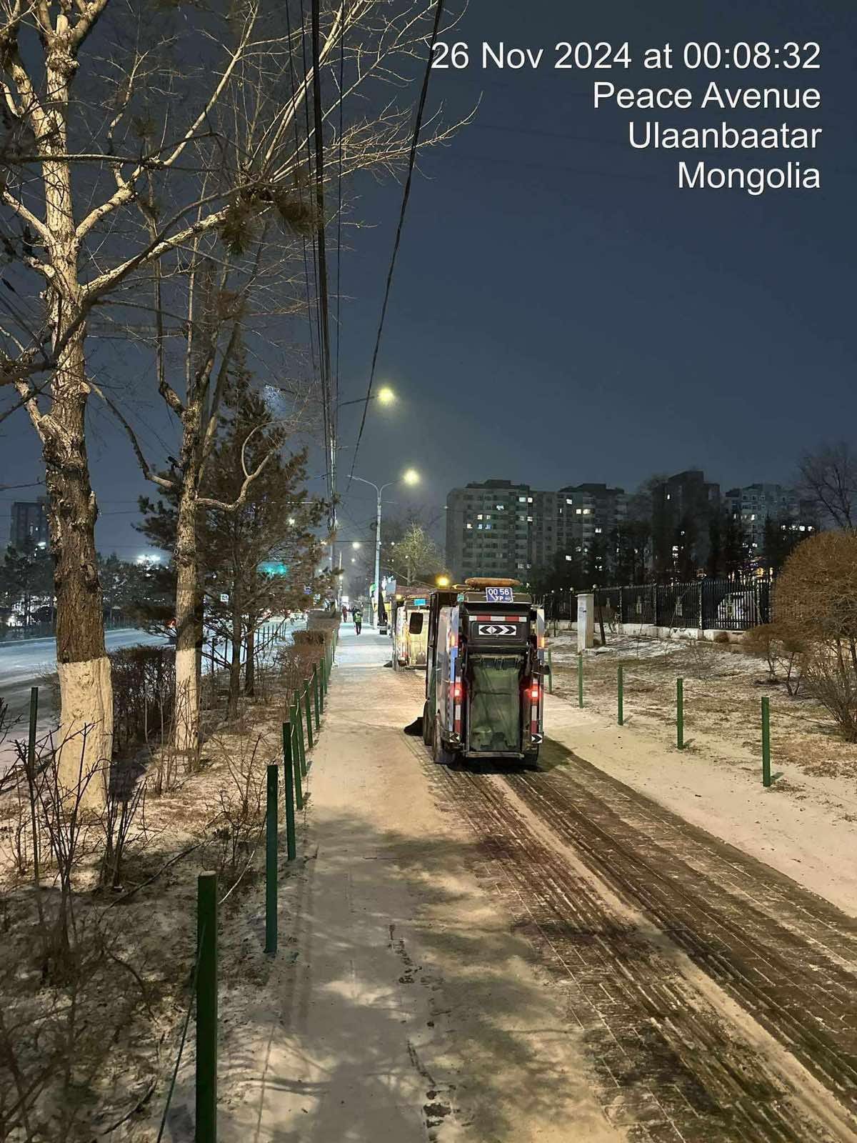 Баянзүрх дүүргийн хэмжээнд нийтийн эзэмшлийн зам талбайн цэвэрлэгээ, үйлчилгээ хариуцагч 6 байгууллага давс бодис цацах 11 тусгай техник хэрэгсэл, 27 машин техниктэйгээр 248 хүний бүрэлдэхүүнтэй ажиллаж авто замын зорчих хэсэг, явган хүний замын цасыг хусаж, халтиргаа, гулгаа үүсэхээс сэргийлж авто замын зорчих хэсэгт 112 тн давс, 29 тн бодис цацан авто замын нуухны цэвэрлэгээг техникээр гүйцэтгэж байна.