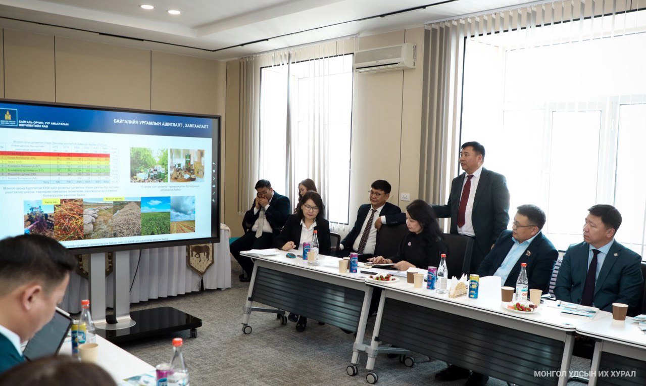 Уулзалтын үеэр тус яамны Нэгдсэн бодлого төлөвлөлтийн газрын дарга X.Мөнхзул байгаль орчин, уур амьсгалын өөрчлөлтийн салбарын эрхзүйн шинэчлэл ба үйл ажиллагааны талаар танилцуулав. Тэрбээр, “Монголын хөгжлийн ирээдүй биологийн олон янз байдал, генетик нөөц”-ийн талаарх илтгэлдээ амьтан, ургамал, ой, усны нөөцийн хамгаалалт, ашиглалт, “Тэрбум мод” үндэсний хөдөлгөөний хэрэгжилт, улсын тусгай хамгаалалттай газар нутаг, хог хаягдал, олон улсын конвенцтой үндэсний бодлогын баримт бичгийн уялдаа холбоо, “РИО-3″ конвенцын зорилго, зорилт, уур амьсгалын өөрчлөлт, цөлжилт, газрын доройтлын төлөв байдал, боловсруулж буй хуулийн төслүүд, байгаль орчны салбарт хэрэгжиж буй нийт стандарт зэрэг асуудлын хүрээнд дэлгэрэнгүй мэдээлэв.