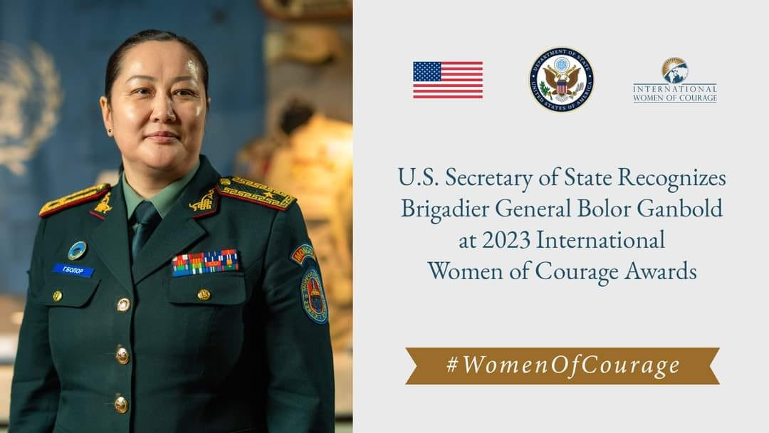 Цагаан ордонд жил бүр болдог 17 дахь удаагийн Олон улсын эмэгтэйчүүдийн хатан зоригийн (IWOC-International Women of Courage Award) шагнал гардуулах ёслол өчигдөр болж Монгол Улсын Зэвсэгт хүчний Жанжин штабын Сургалт, бэлтгэлийн газрын дарга, Бригадын генерал Г.Болор шагналаа гардан авсан байна. Энэхүү 2023 оны “IWOC” шагналыг дэлхийн өнцөг булан бүрээс шалгарсан “Нийгмийн гэрэлт ирээдүй”-г цогцлоохын төлөө ажиллаж буй 11 эмэгтэйд олголоо.