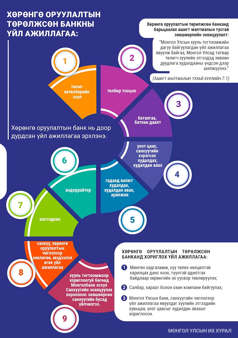 - Банкны тухай хуулиар үйл ажиллагааг нь зохицуулах “банк” болон Хөрөнгө оруулалтын төрөлжсөн банкны хуулиар үйл ажиллагаа нь зохицуулагдах “хөрөнгө оруулалтын төрөлжсөн банк”-ны үйл ажиллагааг давхардуулан эрхлэхгүй.