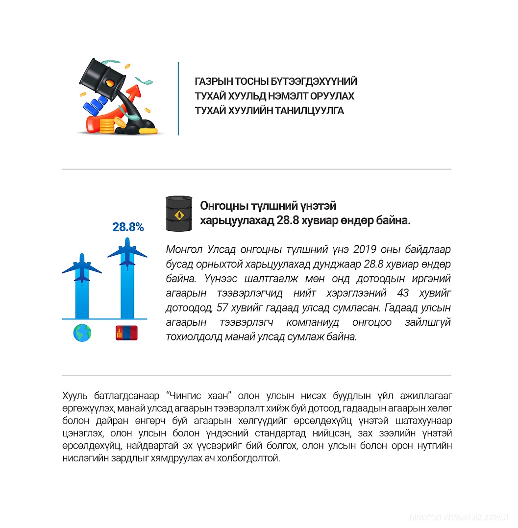 Хууль батлагдсанаар “Чингис хаан” олон улсын нисэх буудлын үйл ажиллагааг өргөжүүлэх, манай улсад агаарын тээвэр хийж буй дотоод, гадаадын агаарын хөлөг болон дайран өнгөрч буй агаарын хөлгүүдийг өрсөлдөхүйц үнэтэй шатахуунаар цэнэглэх, олон улсын болон үндэсний стандартад нийцсэн, зах зээлийн үнэтэй өрсөлдөхүйц, найдвартай эх үүсвэрийг бий болгох, олон улсын болон орон нутгийн нислэгийн зардлыг хямдруулах боломж бүрдэх ач холбогдолтой.