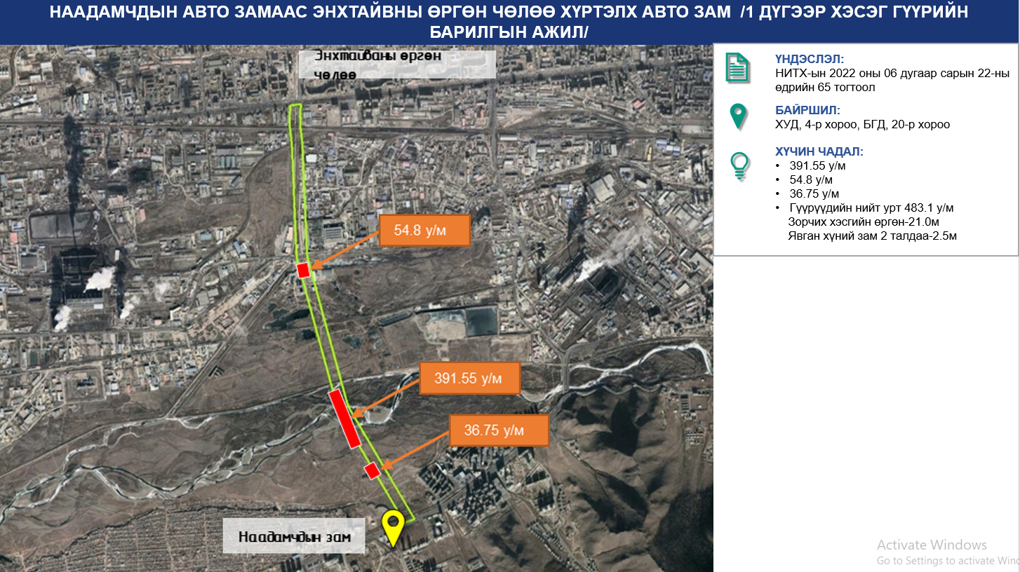 Гурван туслах замын хувьд Чингисийн өргөн чөлөөг Баруун үйлдвэрийн гудамжтай холбох 0.23 километр замын ажлын гүйцэтгэл 40 хувьтай, “Алтай” хотхоны урд хэсгийн 750 метр туслах замын ажлын бэлтгэлийг хангаж байна.