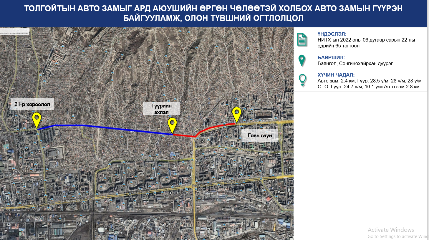 -Улаанбаатар хотын авто замын түгжрэлд гол нөлөө үзүүлэх замын ажлуудын хүрээнд Нийслэлийн Замын хөгжлийн газартай зөвшилцөөд 90 байршлыг тодорхойлсон байдаг. Эдгээр байршлыг тодорхойлоод иргэдийн зорчилт хөдөлгөөнийг тодорхойлох судалгааг 2022 онд хийсэн. Өөрөөр хэлбэл, энэ 90 байршил нь гол гудамж замууд дээрх иргэдийн зорчих хөдөлгөөний урсгалд хэрхэн нөлөөлөх вэ гэдгийг судалсан гэсэн үг. Энэхүү судалгаан дээр үндэслээд ач холбогдол, нөлөө нь өндөр байршлууд дээр эхний ээлжийн бүтээн байгуулалтын ажлыг хийж байгаа юм. Ер нь энэ 90 байршлын ажлыг хийж гүйцэтгэснээр хотын гол гудамж замуудын ачаалал 20 хувиар буурна гэсэн тооцоолол бий.