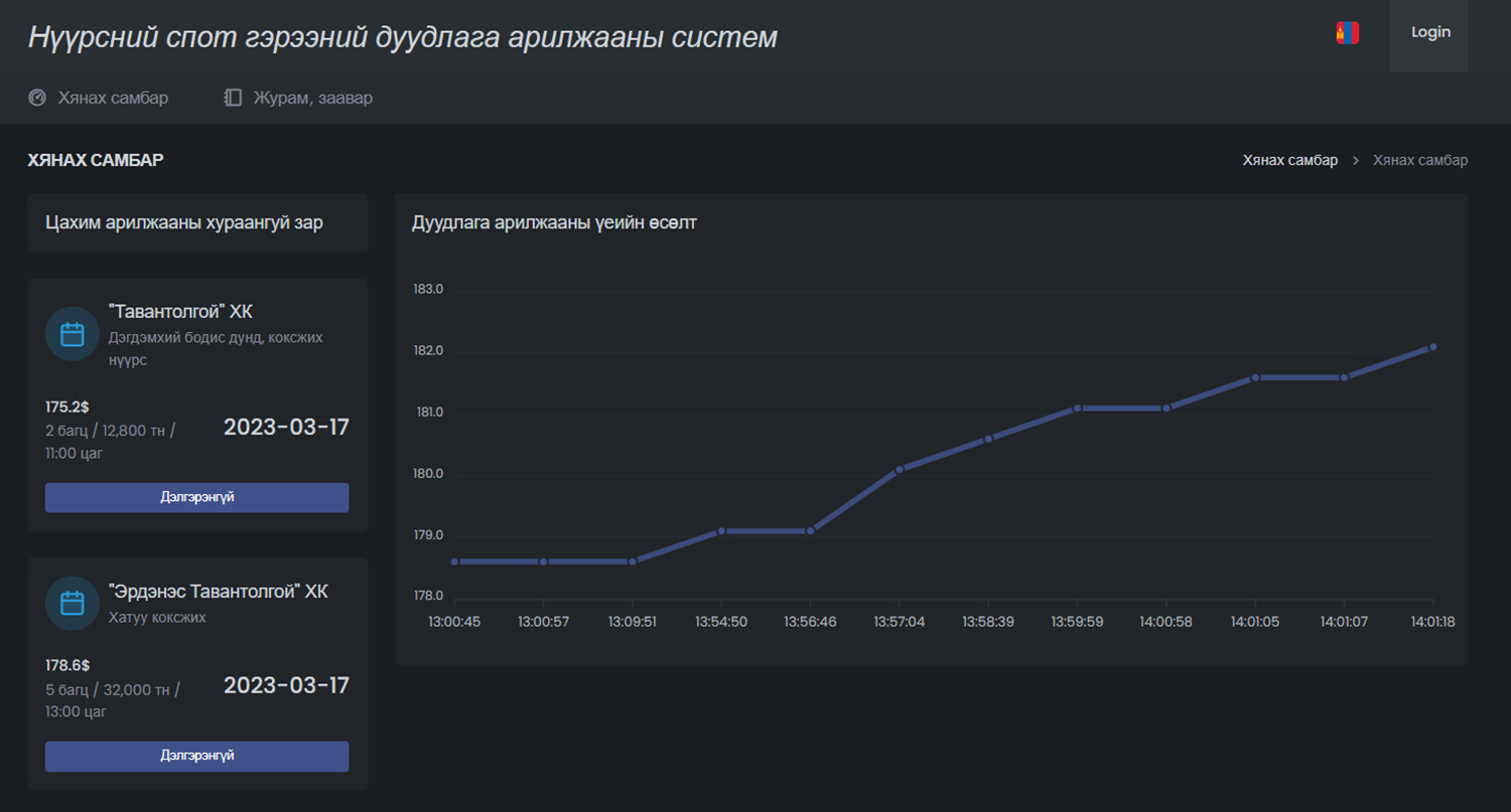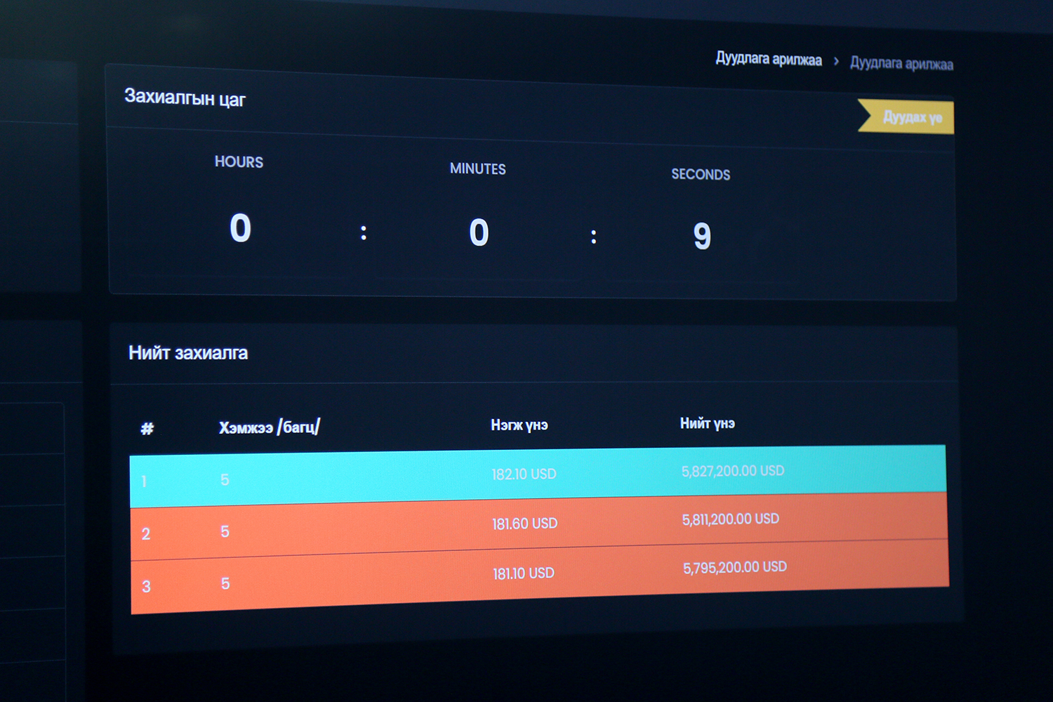“Эрдэнэс Тавантолгой” ХК нүүрсний ээлжит цахим арилжааг амжилттай зохион байгууллаа. Энэ удаагийн цахим арилжаанд БНХАУ-ын Xianjiade Energy resources International, “Shuangquan Energy, Wangjin Energy зэрэг гурван компани оролцож нэг тонн нүүрсийг 178,6 ам.доллароос дуудаж 182,1 ам.доллароор арилжлаа.