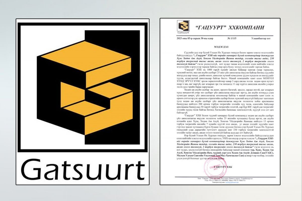 “Сүүлийн үед нэр бүхий Улсын Их Хурлын гишүүн болон зарим хэвлэл мэдээллийн байгууллагууд “…Гацуурт” ХХК-ийг өөрийн хамаарал бүхий компаниудаар дамжуулан Хүнс Хөдөө Аж Ахуй, Хөнгөн Үйлдвэрийн Яамны тендер, зээлийн талыг авдаг, 230 тэрбум төгрөгний талыг авсан, авсан зээлээ төлөөгүй, 2 тэрбум төгрөгийн зээлээ төлөхгүй байгаа” гэсэн үндэслэлгүй, илт худал ташаа мэдээллийг олон нийтийн хэвлэл мэдээллийн хэрэгслээр тарааж байгаа учир арга буюу энэхүү мэдэгдлийг гаргаж байна.