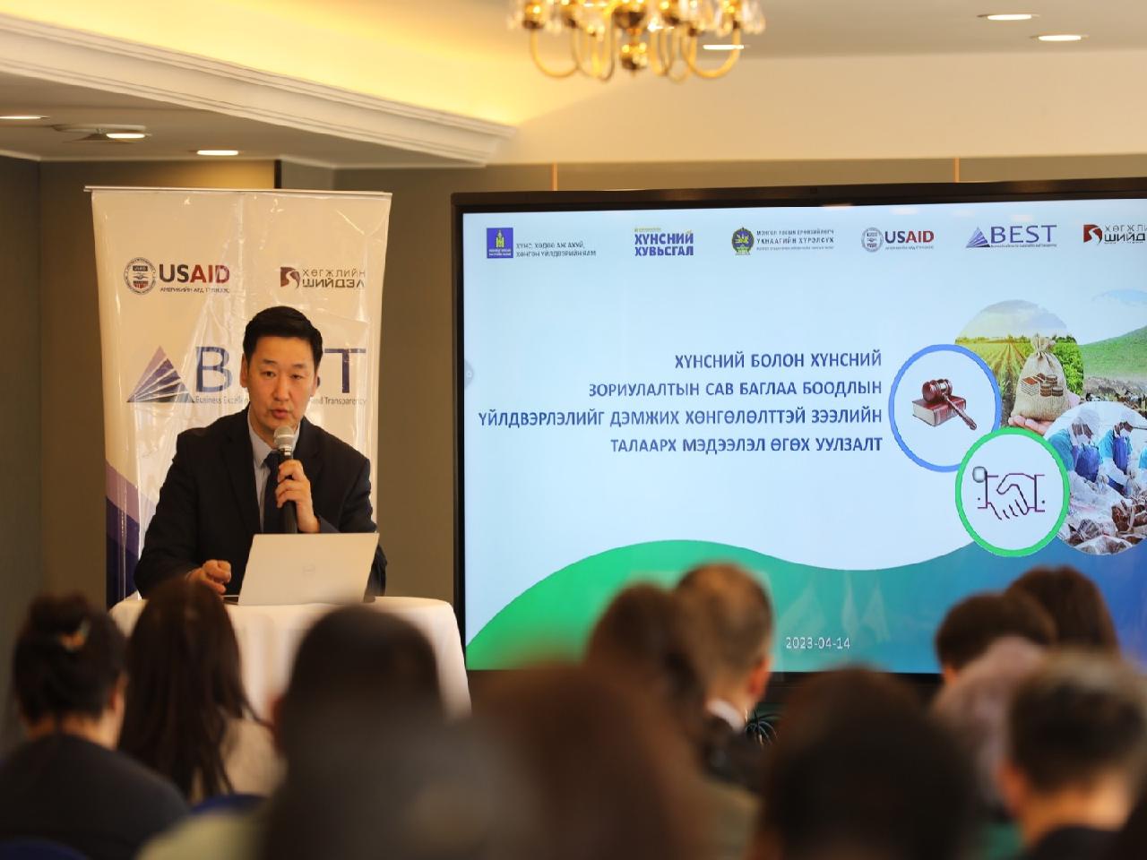 Монгол Улсын Ерөнхийлөгчийн Тамгын газар болон Хүнс, хөдөө аж ахуй, хөнгөн үйлдвэрийн яам, АНУ-ын Засгийн газрын санхүүжилтээр хэрэгжиж буй “Бизнесийн тогтвортой хөгжлийг сайжруулах, ил тод байдлыг нэмэгдүүлэх” (BEST) хөтөлбөртэй хамтран сав баглаа боодлын үйлдвэрлэл эрхлэгчид, мэргэжлийн холбоодын төлөөлөл 70 гаруй аж ахуйн нэгжид “Хүнсний болон хүнсний зориулалтын сав баглаа боодлын үйлдвэрлэлийг дэмжих хөнгөлөлттэй зээл”-ийн талаар мэдээлэл болон бусад асуудлаар мэдээлэл өгч, санал солилцох уулзалт хийлээ.