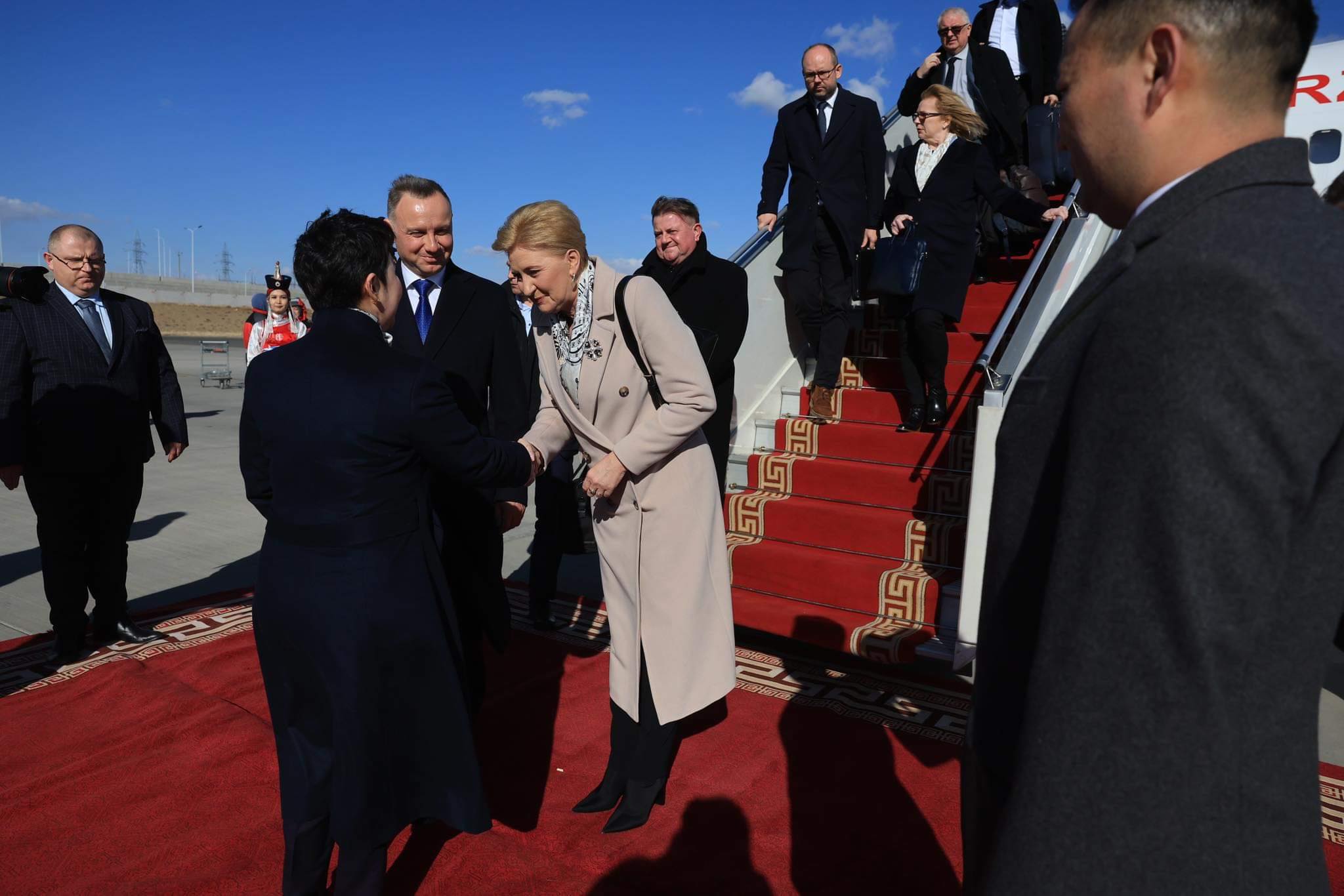 Ерөнхийлөгч Анджей Дудаг гэргийн хамт “Чингис хаан” олон улсын нисэх онгоцны буудалд газардахад Гадаад харилцааны сайд Б.Батцэцэг, БНПУ-аас Монгол Улсад суугаа Онц бөгөөд Бүрэн эрхт Элчин сайд Кшыштоф Бойко болон албаны бусад хүн угтан авав.