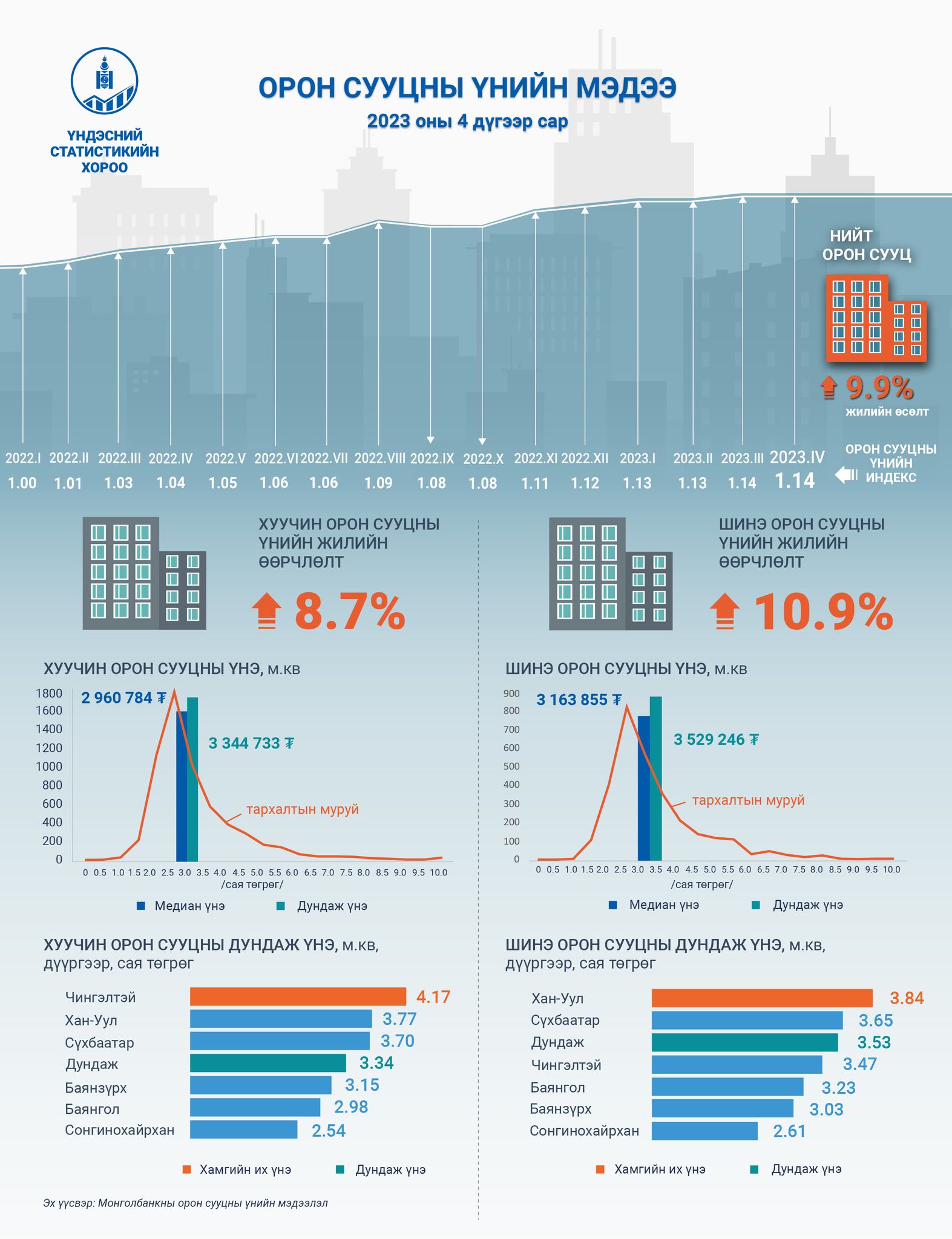 Улаанбаатар хотын орон сууцны үнэ 2023 оны 4 дүгээр сард өмнөх оны мөн үеэс 9.9 хувиар, өмнөх сараас 0.2 хувиар тус тус өсжээ.