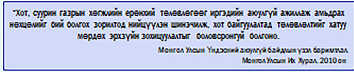 -Ер нь норм, дүрэм, стандарт гэдэг бол хүн амын эрүүл ахуй, аюулгүй байдлын хэм хэмжээг тогтоох баримт бичиг. Хүн эрүүл, аюулгүй орчинд амьдрах Үндсэн хуулиар олгогдсон эрхийг нь хангах зорилготой. Улс орон бүрийн түүхэн хөгжлийн онцлог нь өөр өөр. Монгол Улсын хувьд Нийслэл Улаанбаатар хотод хүн амын бараг тал нь газар нутгийнхаа 03% дээр л ажиллаж амьдарч байна.