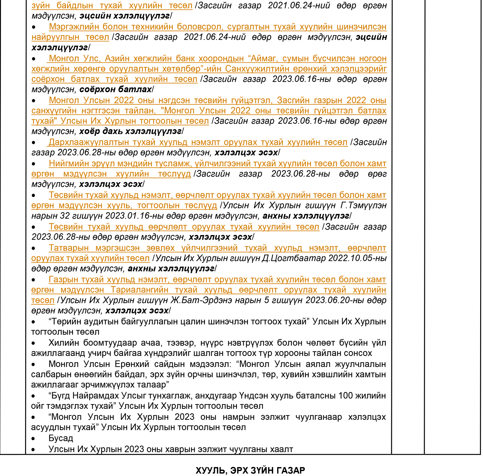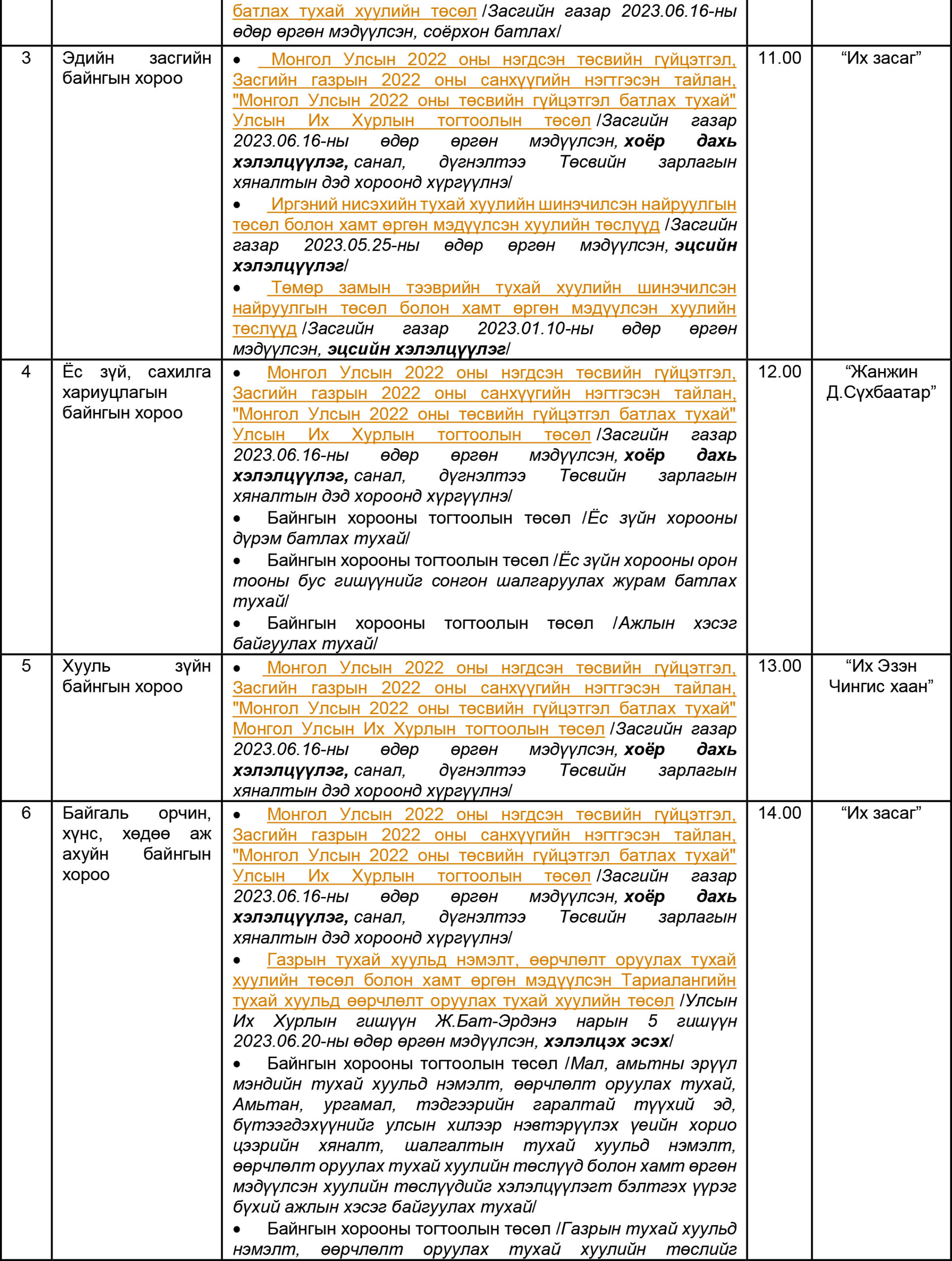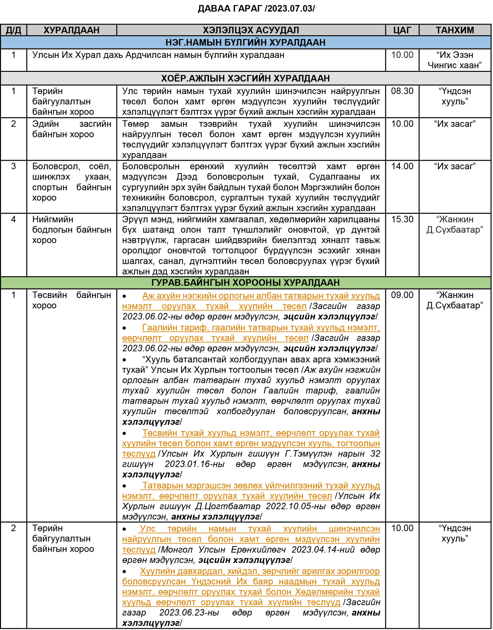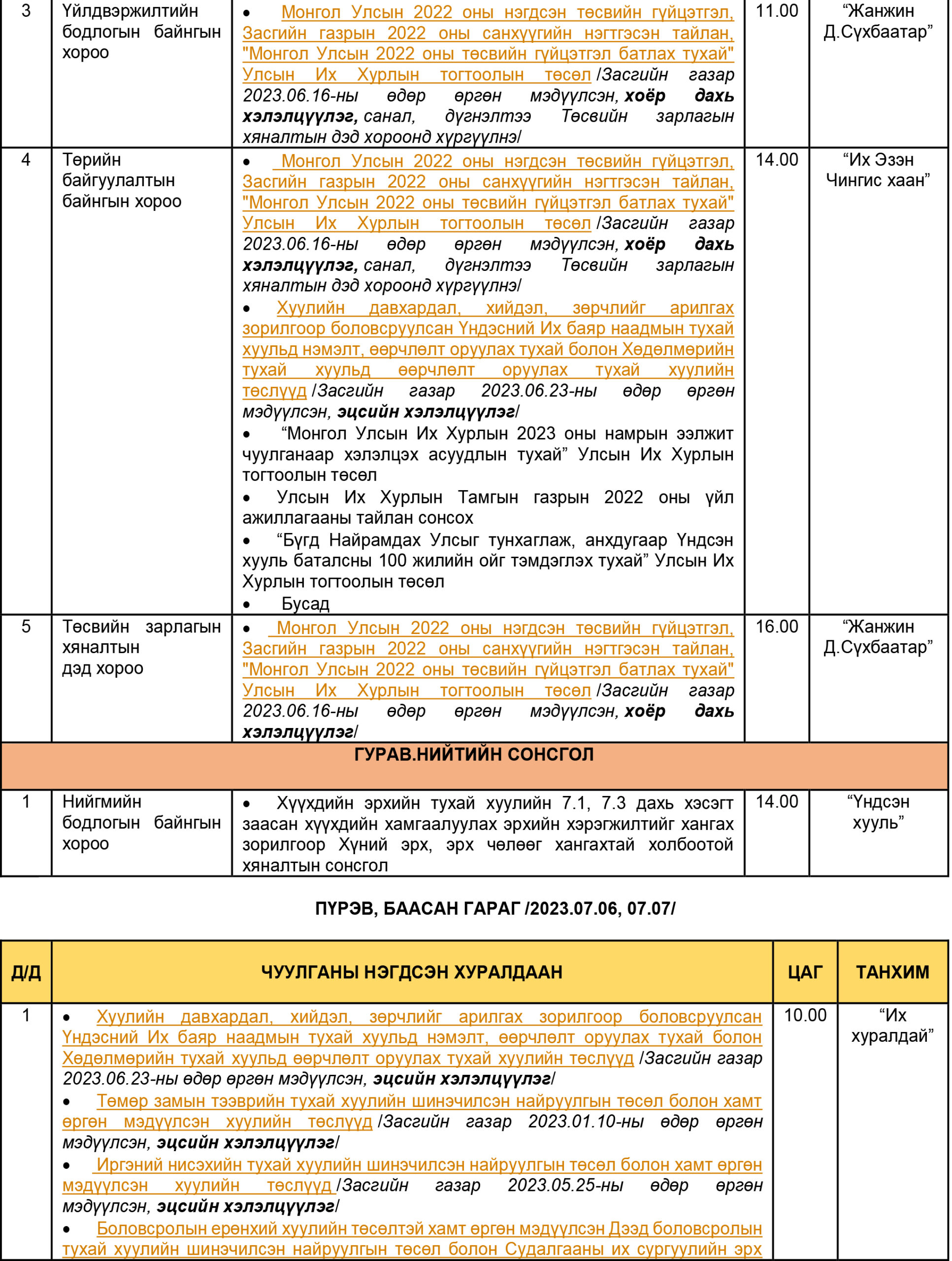 УЛСЫН ИХ ХУРЛЫН 2023 ОНЫ ХАВРЫН ЭЭЛЖИТ ЧУУЛГАНЫ 07 ДУГААР САРЫН 03-НААС 07-НЫ ӨДРИЙН ХУРАЛДААНААР ХЭЛЭЛЦЭХ АСУУДЛЫН ТОВ, ДАРААЛАЛ