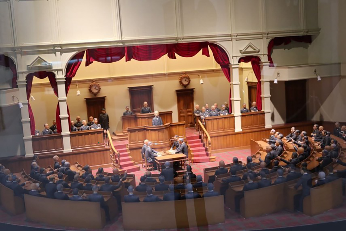 Тухайн үед ямар танхимд, яаж хуралдаж байсныг музейд харах боломжтой. Тухайн үед мөн хоёр танхимтай. Язгууртны буюу төлөөлөгчдийн танхимтай байсан. Язгууртны танхим нь эзэн хаан шууд томилсон язгууртнуудаас бүрддэг. Төлөөлөгчдийн танхим нь сонгуулиар сонгогдсон төлөөлөгчдөөс бүрдэж байв. Музейд бас анхны 300 гишүүний зураг байна. Бүгд эрэгтэй гишүүд. 25 удаа дараалан сонгогдож, 63 жил гишүүнээр ажилласан алдартай парламентч нь Японы Үндсэн хуульт засаглалын эцэг хэмээгддэг Озаки юм.