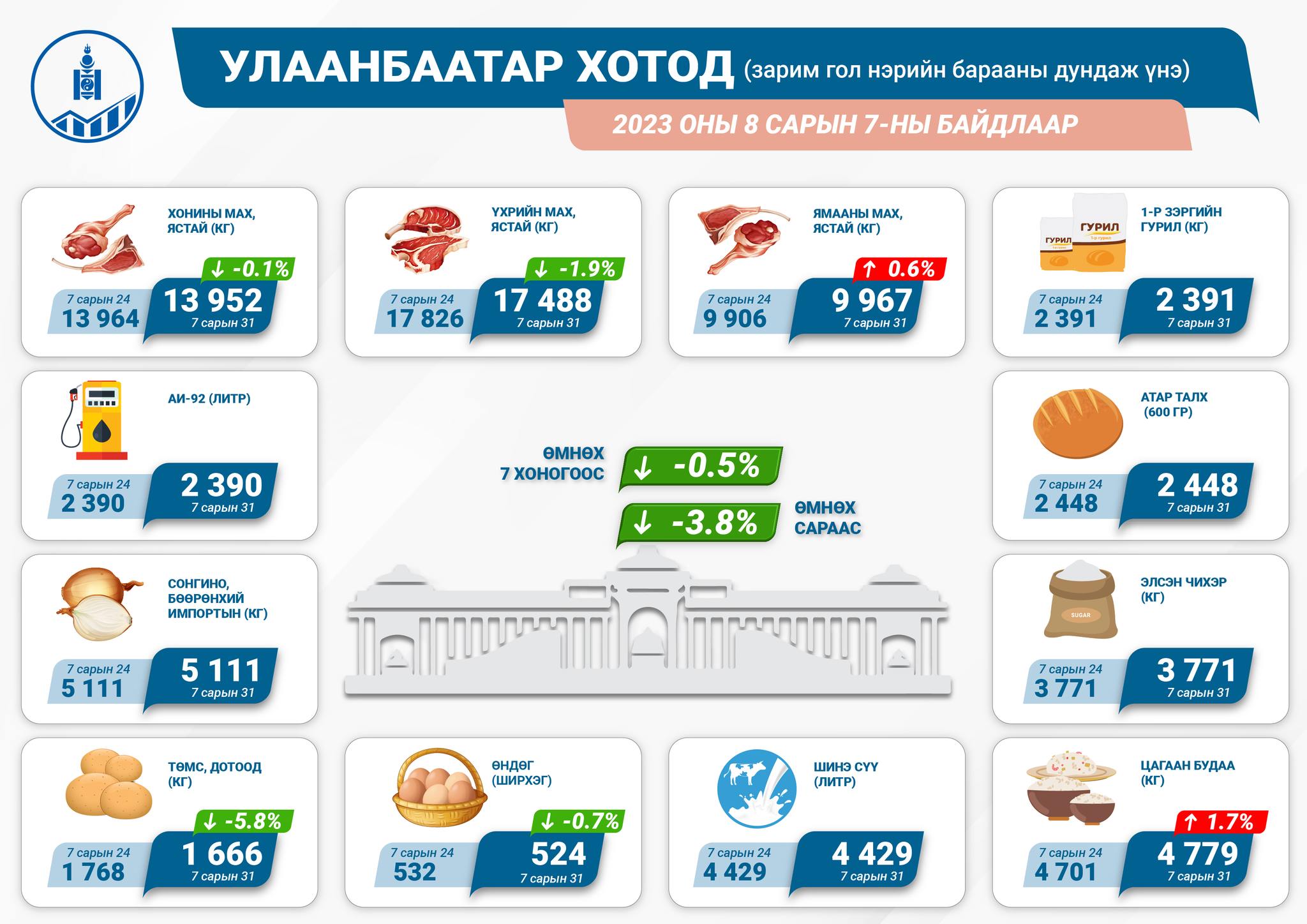 2023 оны 8 сарын 07-ны байдлаар Улаанбаатар хотод хүнсний гол нэрийн барааны дундаж үнэ өмнөх сараас 3.8 хувь, өмнөх 7 хоногоос 0.5 хувиар тус тус буурсан байна.