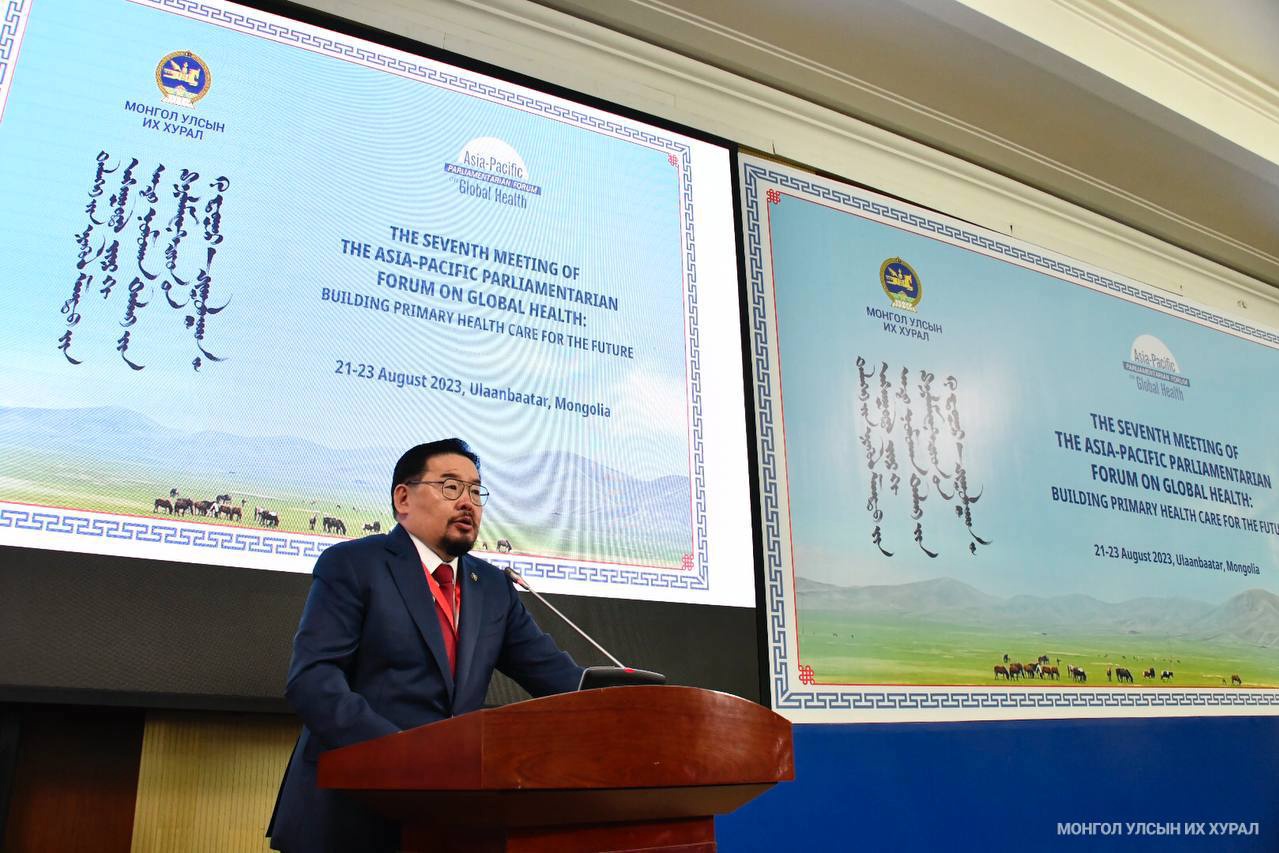 Тэрбээр чуулганыг нээж хэлсэн үгийнхээ эхэнд, Дэлхийн эрүүл мэндийн асуудлаарх Ази, Номхон далайн орнуудын парламентчдын VII чуулганд оролцогчдыг Монгол Улсад тавтай саатахыг хүсэн ерөөгөөд, дэлхийн улс орнууд эрх тэгш байдал, шударга ёсны зарчимд нийцсэн, анхан шатны тусламж үйлчилгээнд суурилсан эрүүл мэндийн тогтолцоог бүрдүүлж, тусламж үйлчилгээг ард иргэд, нийтэд хүртээмжтэй болгохыг зорьж буйг онцлон тэмдэглэсэн.