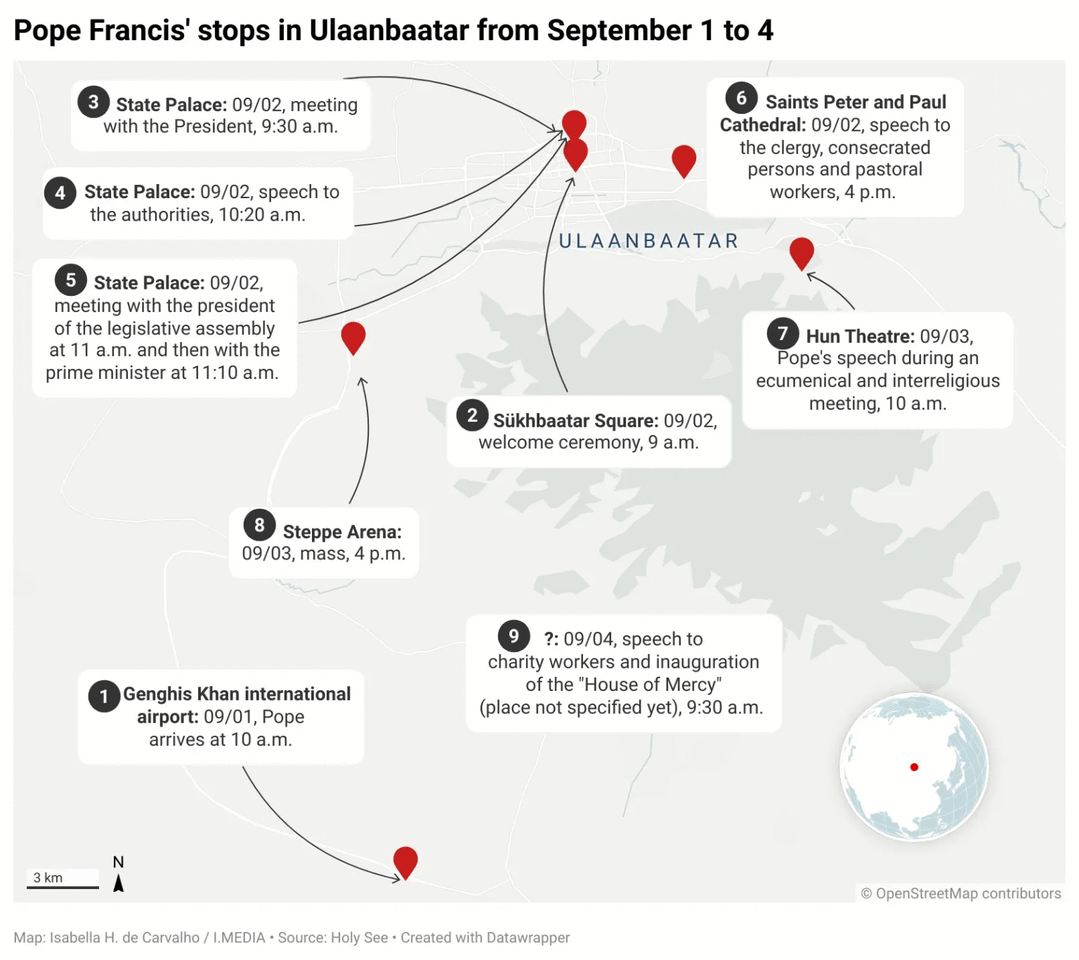 Тэгвэл Ромын пап Францис наймдугаар сарын 31-нээс есдүгээр сарын 4 хүртэл Монголд католик шашны тэргүүний анхны түүхэн айлчлал хийх гэж байна. Тэрээр юуны өмнө Монголын нийт ард түмэн, тус улс дахь католик шашны жижиг нийгэмлэгт хандан үг хэлэх юм. Үүний сацуу Орос, Хятадын дунд хавчигдсан их хаадын өлгий нутаг, социалист байсан тус оронд хийх түүний айлчлал Гэгээн ширээт улсын хувьд стратегийн чухал алхам болох билээ.