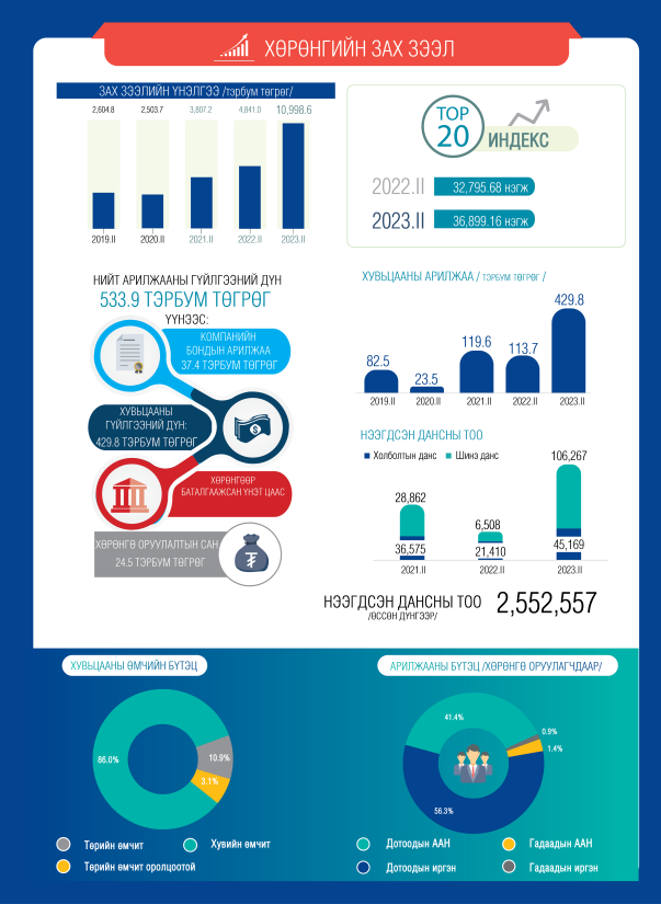 Энэ оны хоёрдугаар улирлын байдлаар хөрөнгийн зах зээлийн үнэлгээ өмнөх оны мөн үеэс 2.3 дахин өсөж 10,998.6 тэрбум төгрөгт хүрсэн байна.